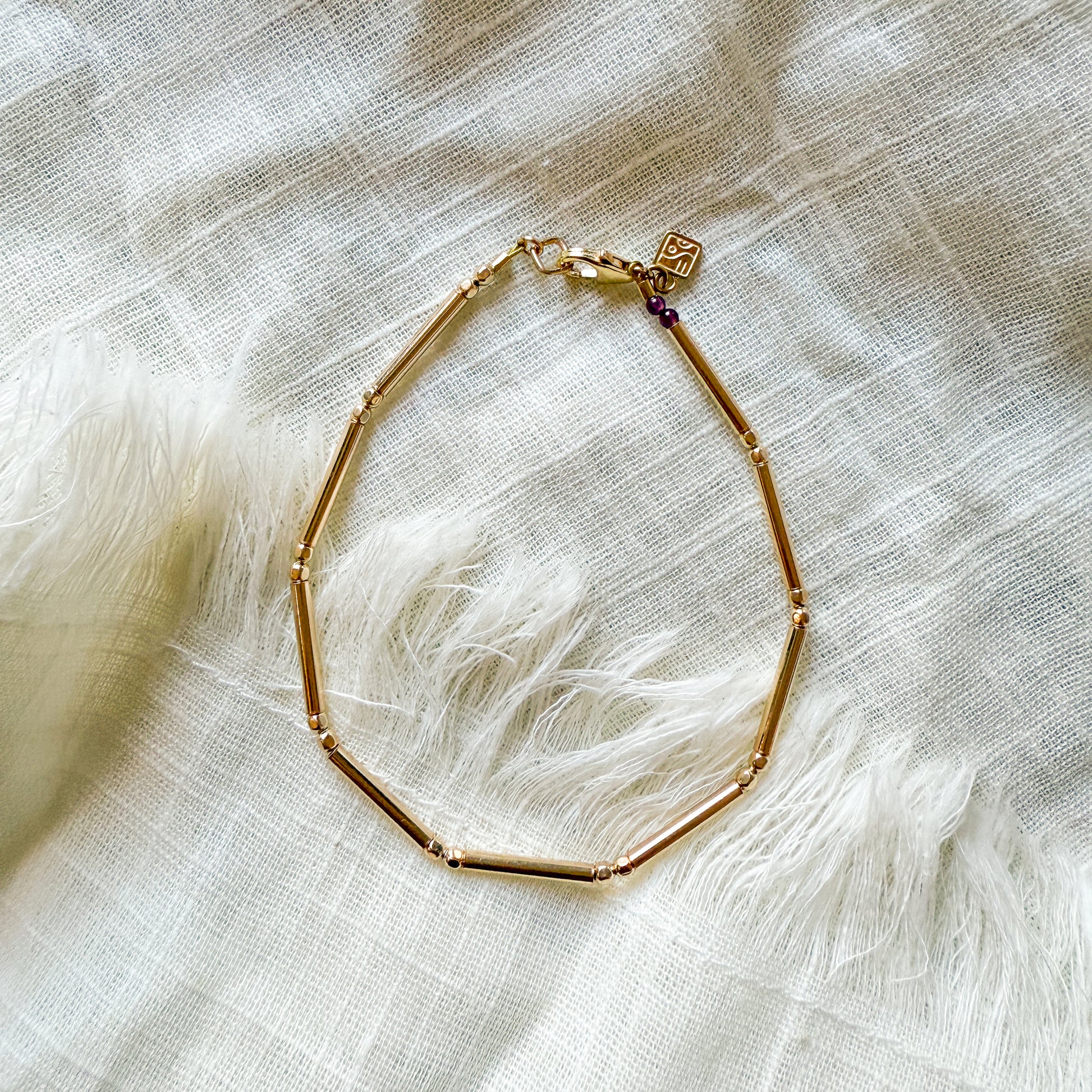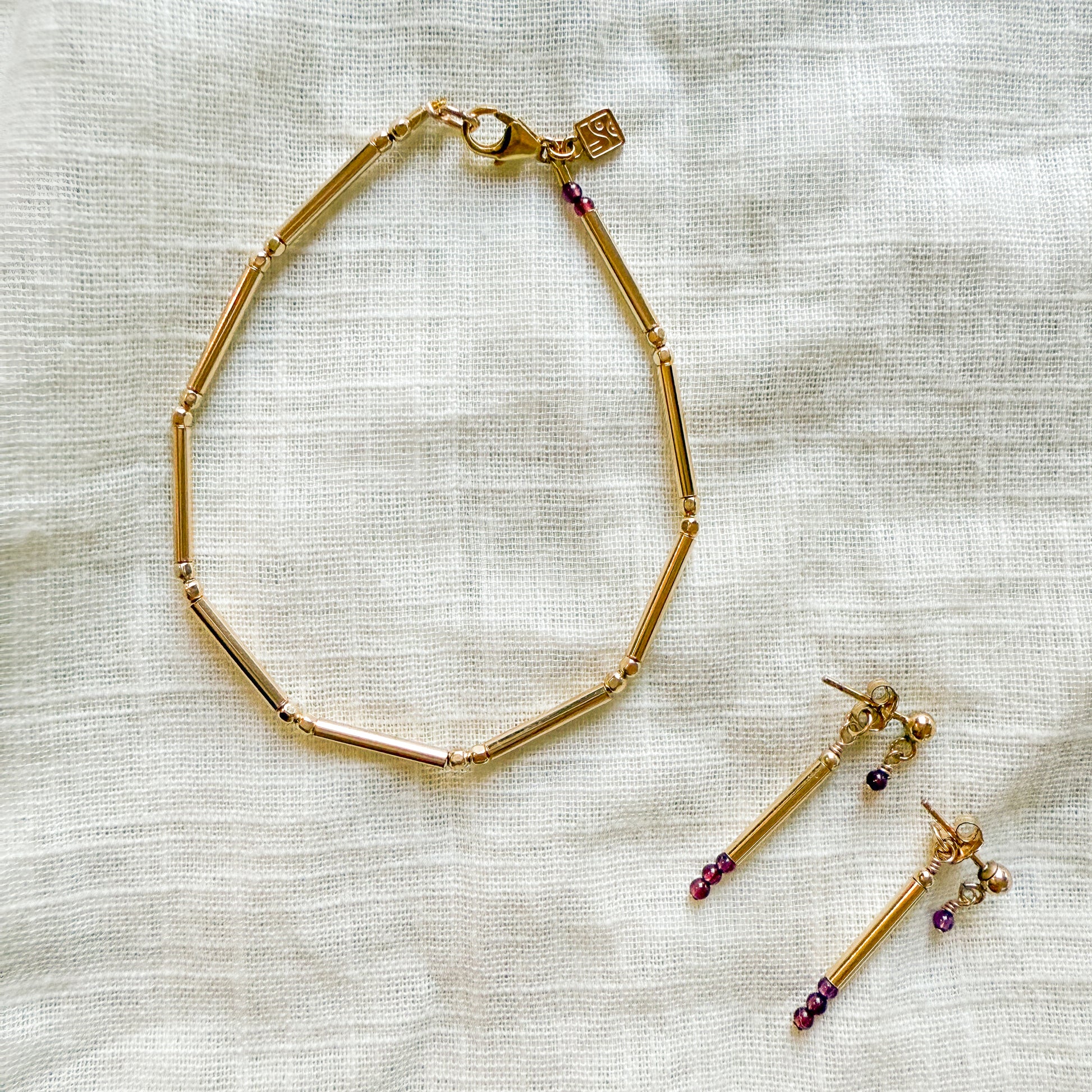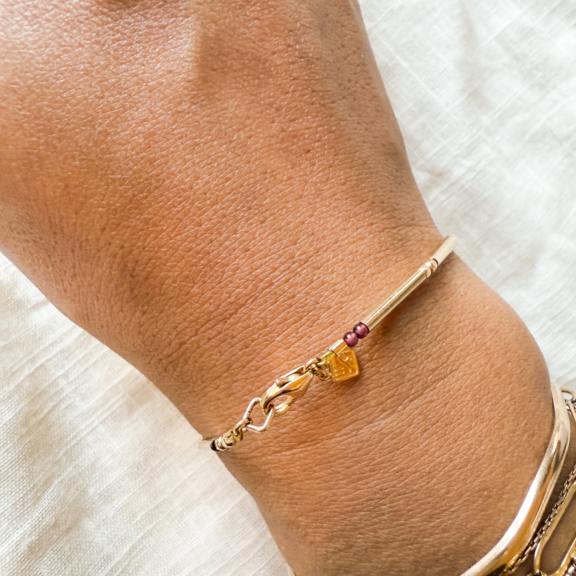 The Dear Me Bracelet serves as a powerful reminder of the journey toward self-love and personal growth. The bracelet features nine elegant long tube beads each separated by two gold-filled nugget beads. The eighteen gold-filled nugget beads represent the time it takes to form a new habit – eighteen days. Two radiant garnets (stones of commitment) finish off the piece, symbolizing the sweet victory of reaching your goal. Let this bracelet remind you that while your dreams may feel distant, each small step brings you closer to your true potential.