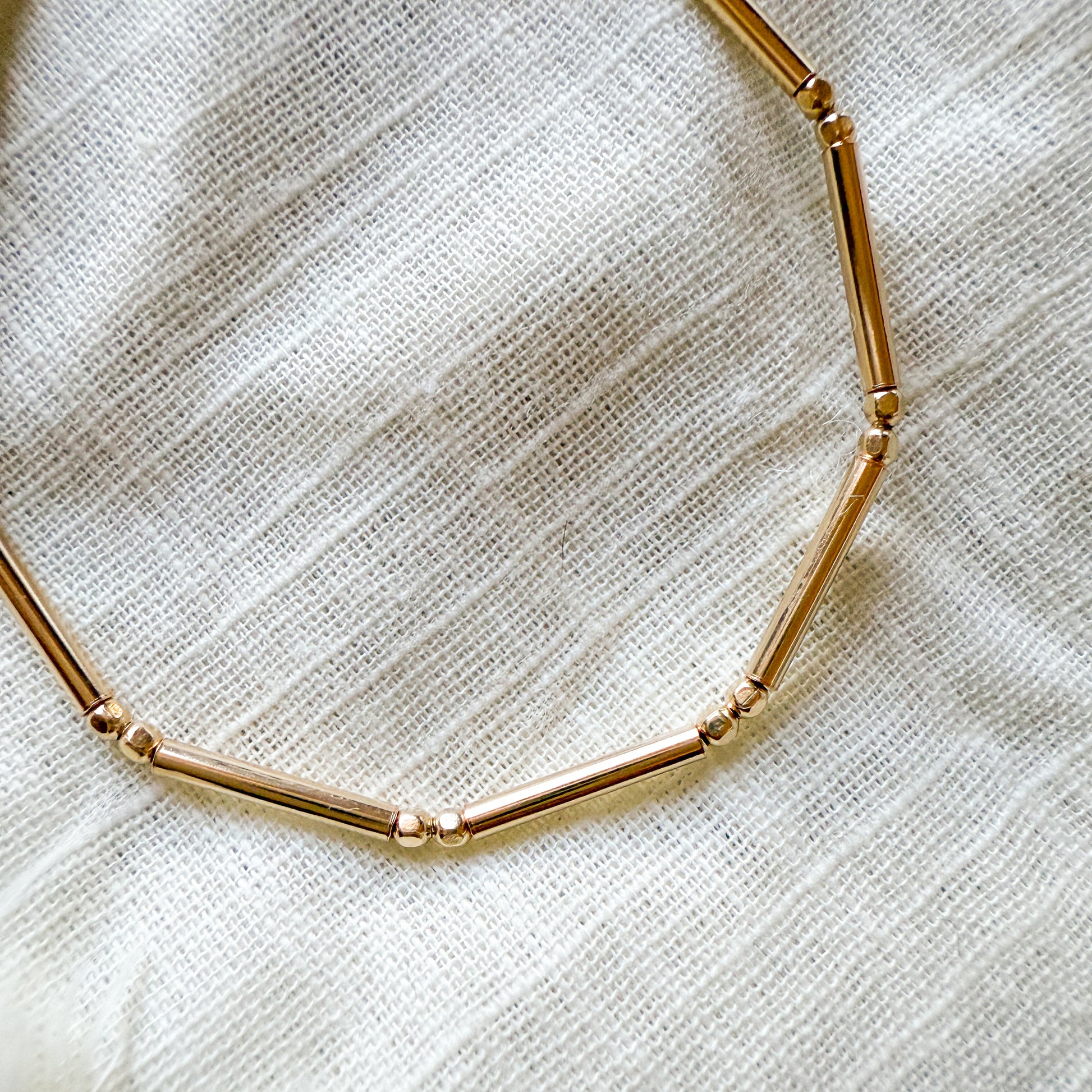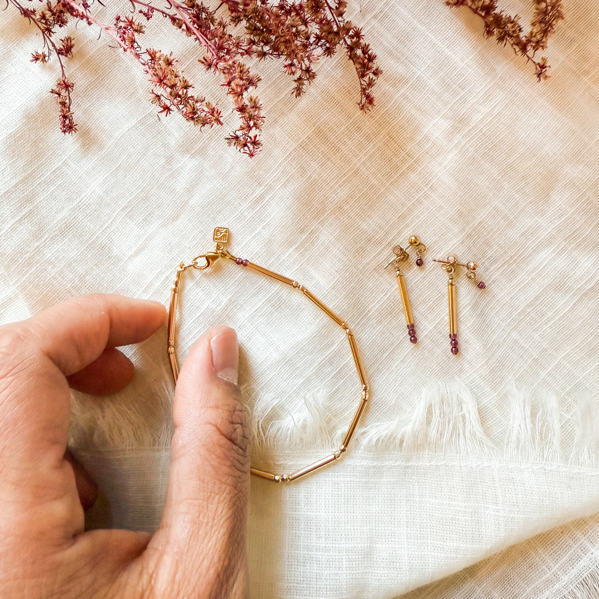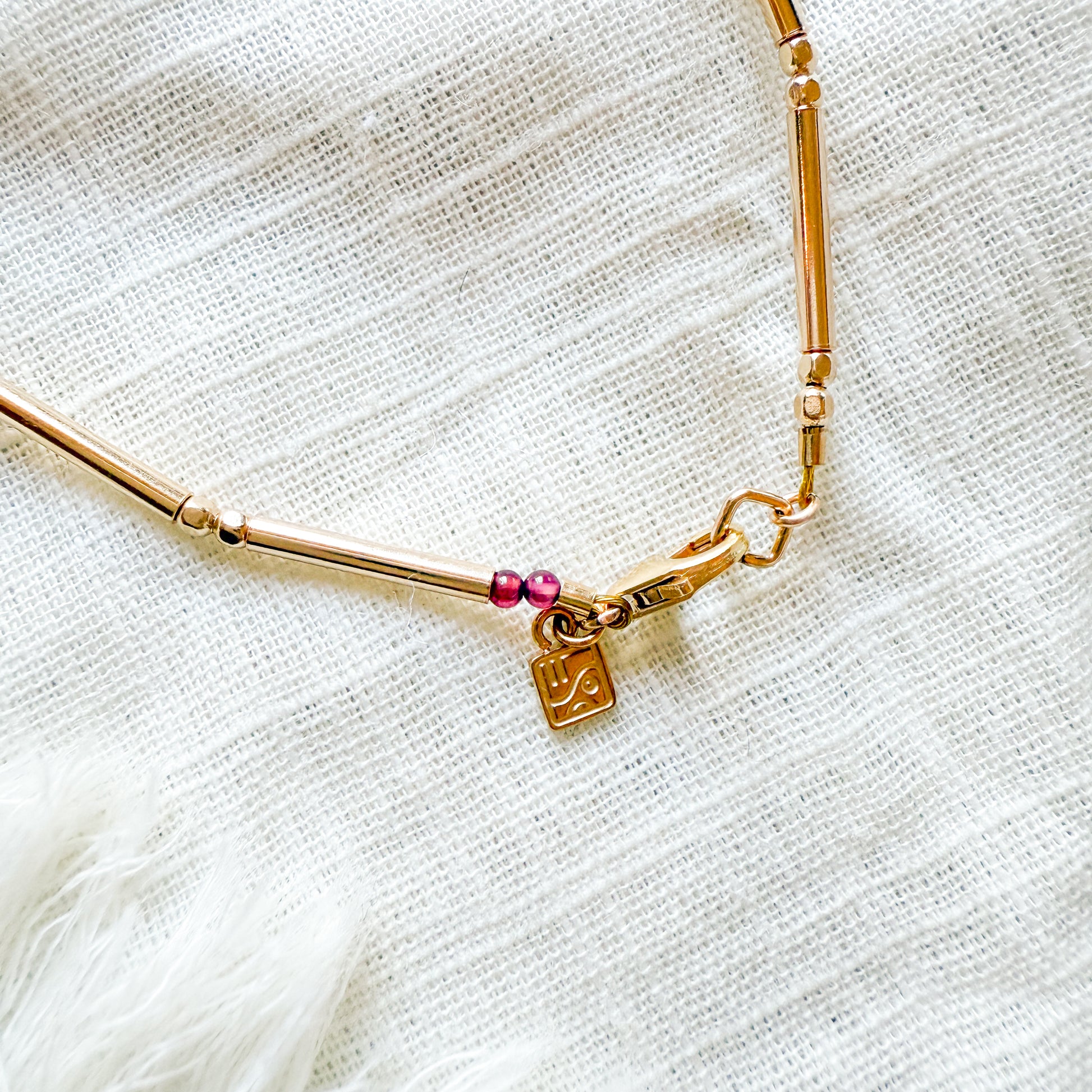 The Dear Me Bracelet serves as a powerful reminder of the journey toward self-love and personal growth. The bracelet features nine elegant long tube beads each separated by two gold-filled nugget beads. The eighteen gold-filled nugget beads represent the time it takes to form a new habit – eighteen days. Two radiant garnets (stones of commitment) finish off the piece, symbolizing the sweet victory of reaching your goal. Let this bracelet remind you that while your dreams may feel distant, each small step brings you closer to your true potential.