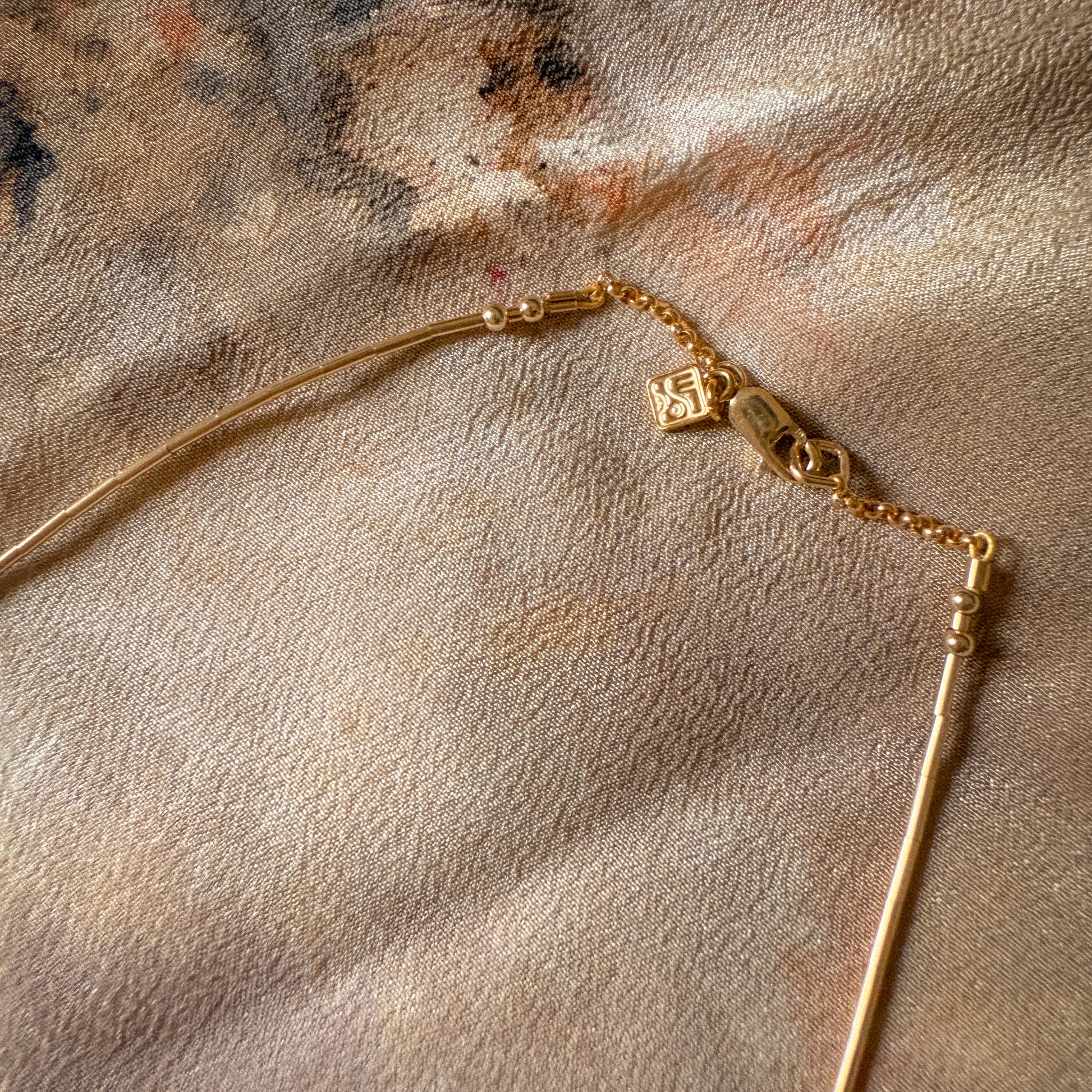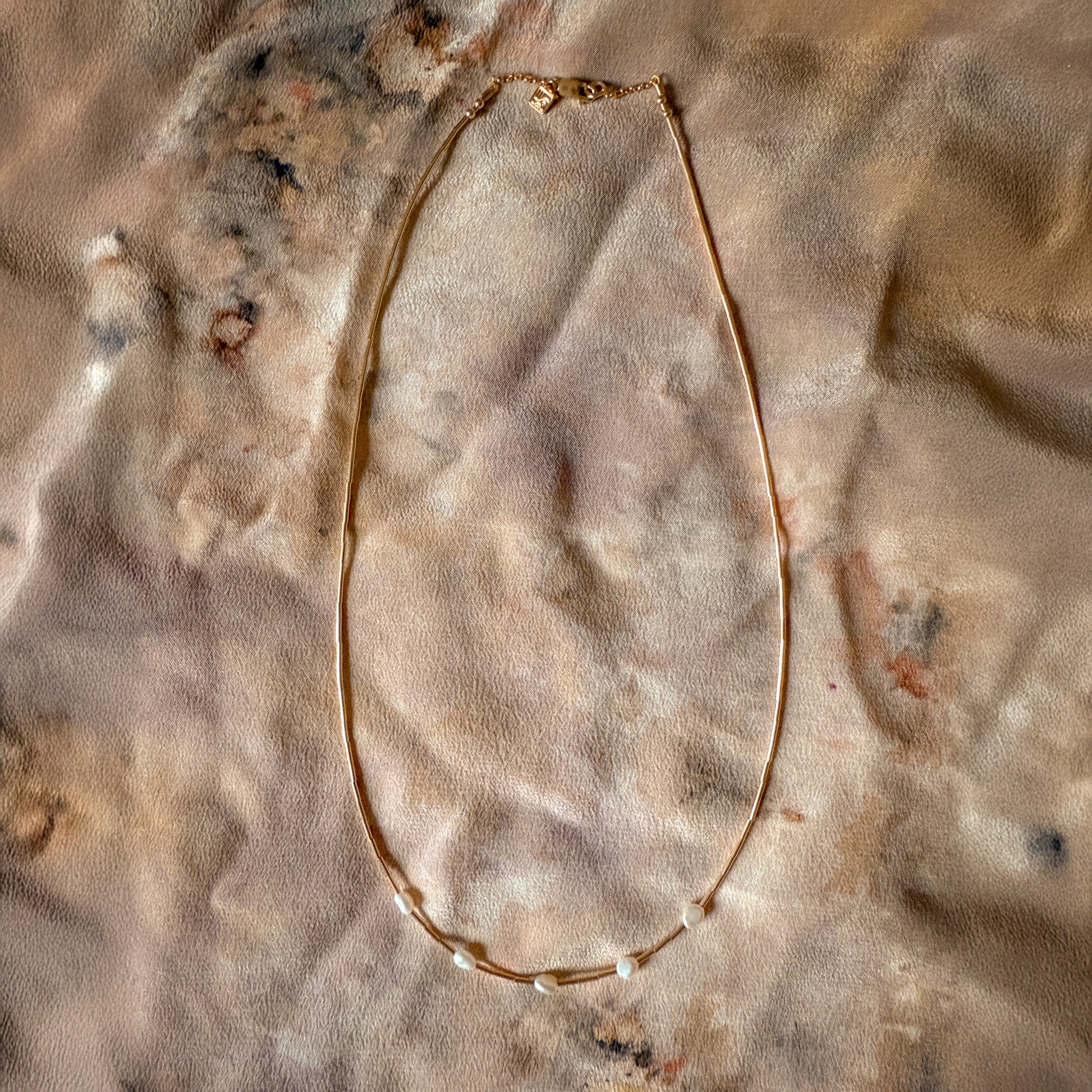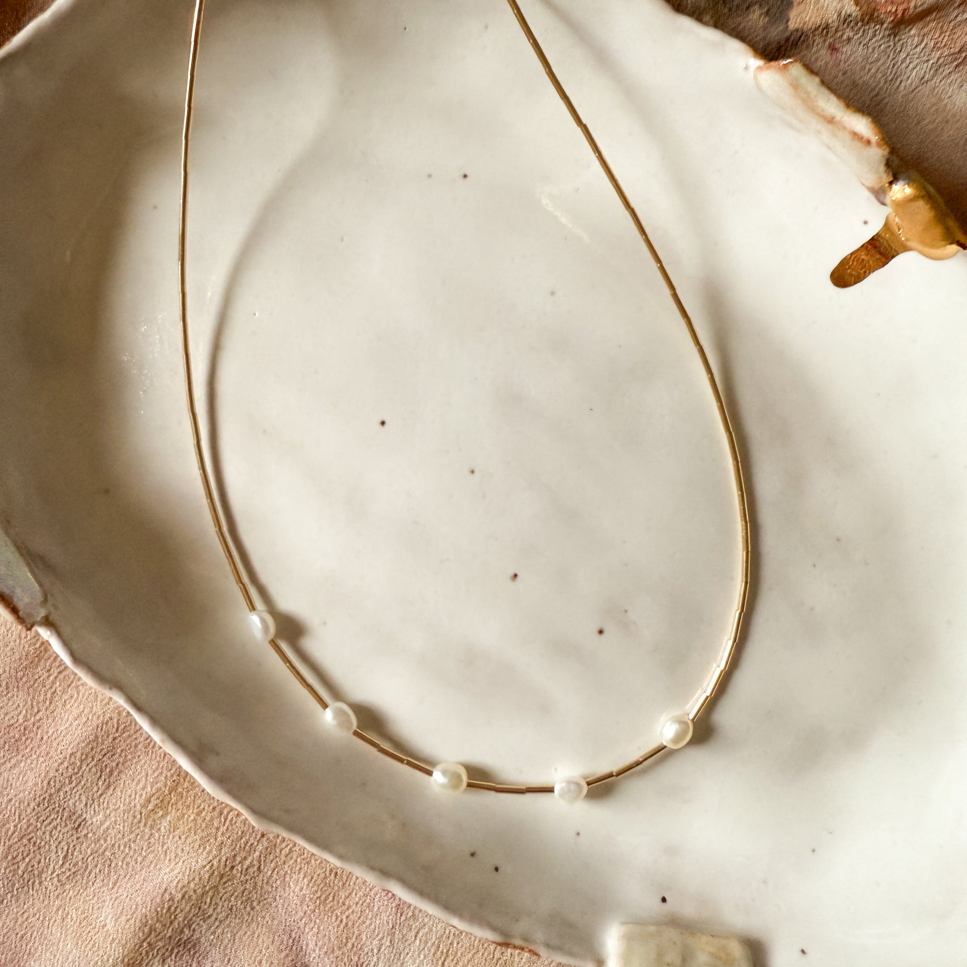5 freshwater pearls are suspended between gold-filled tube beads to make a liquid like chain that sits so gently on your décolletage.