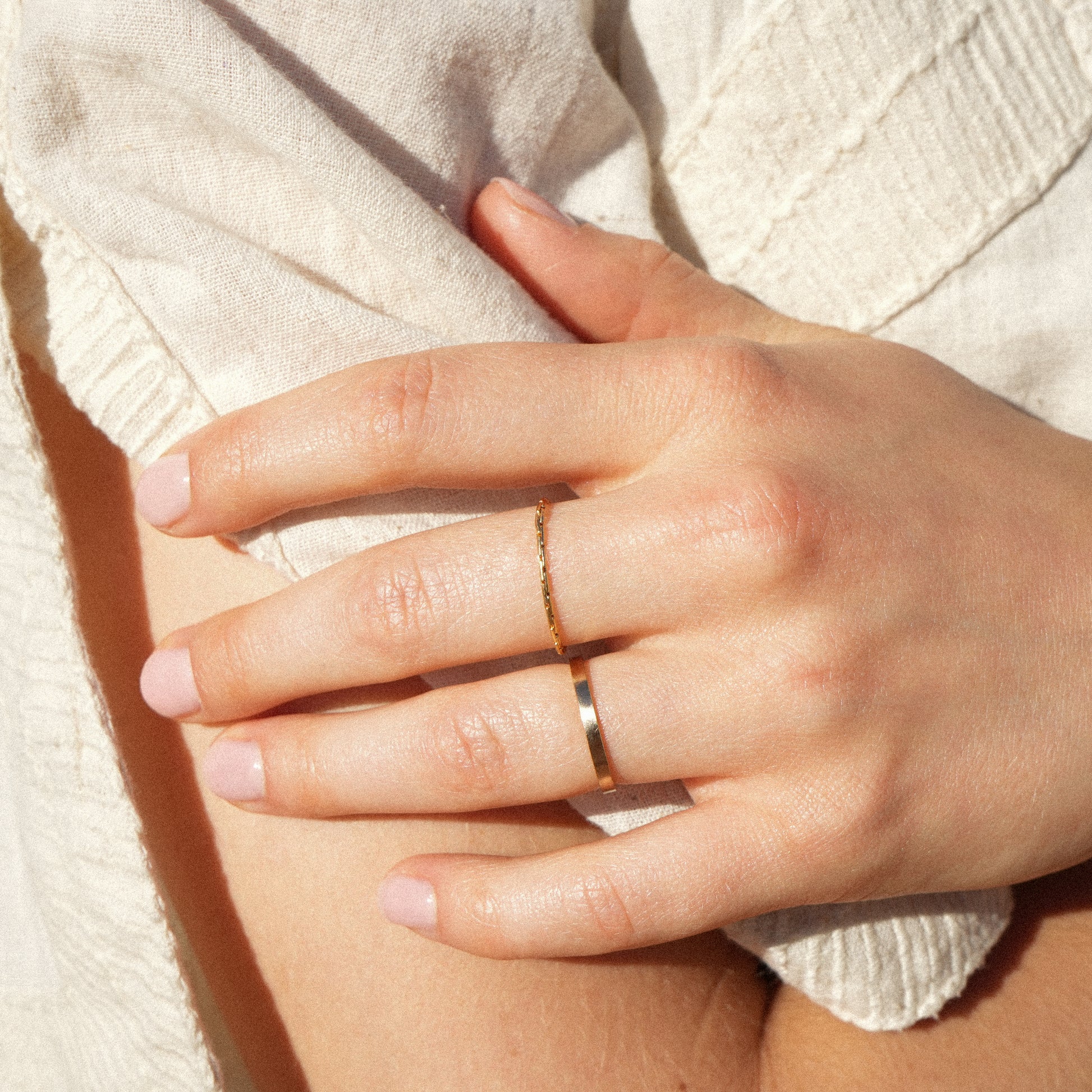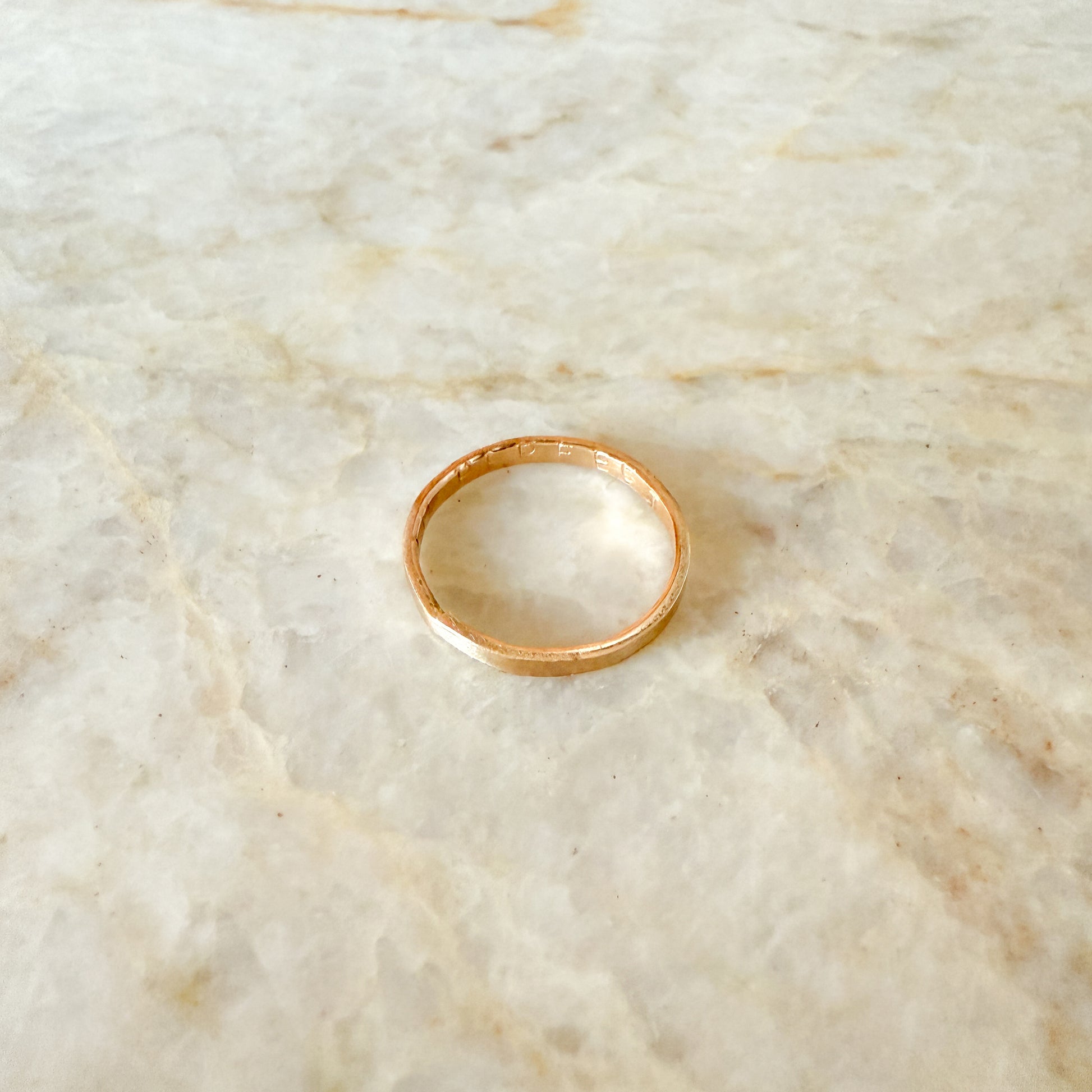 This ring was forged out of an experimental journey trying to evolve one's self outside of designing from habit. Intentionally left with an organic look donning imperfect soldered seams, slightly hammered surfaces, and hand-stamped with the word "IMPERFECT" on the inside, this ring is meant to be worn daily to go through the ups and downs of life and having the safety-net of knowing that things may not turn out perfectly, but at least you're trying your best. If one looks at the word "IMPERFECT," broken down it says "I'm perfect" and that's exactly right - you are perfection with all your flaws and that is why you are so uniquely you.