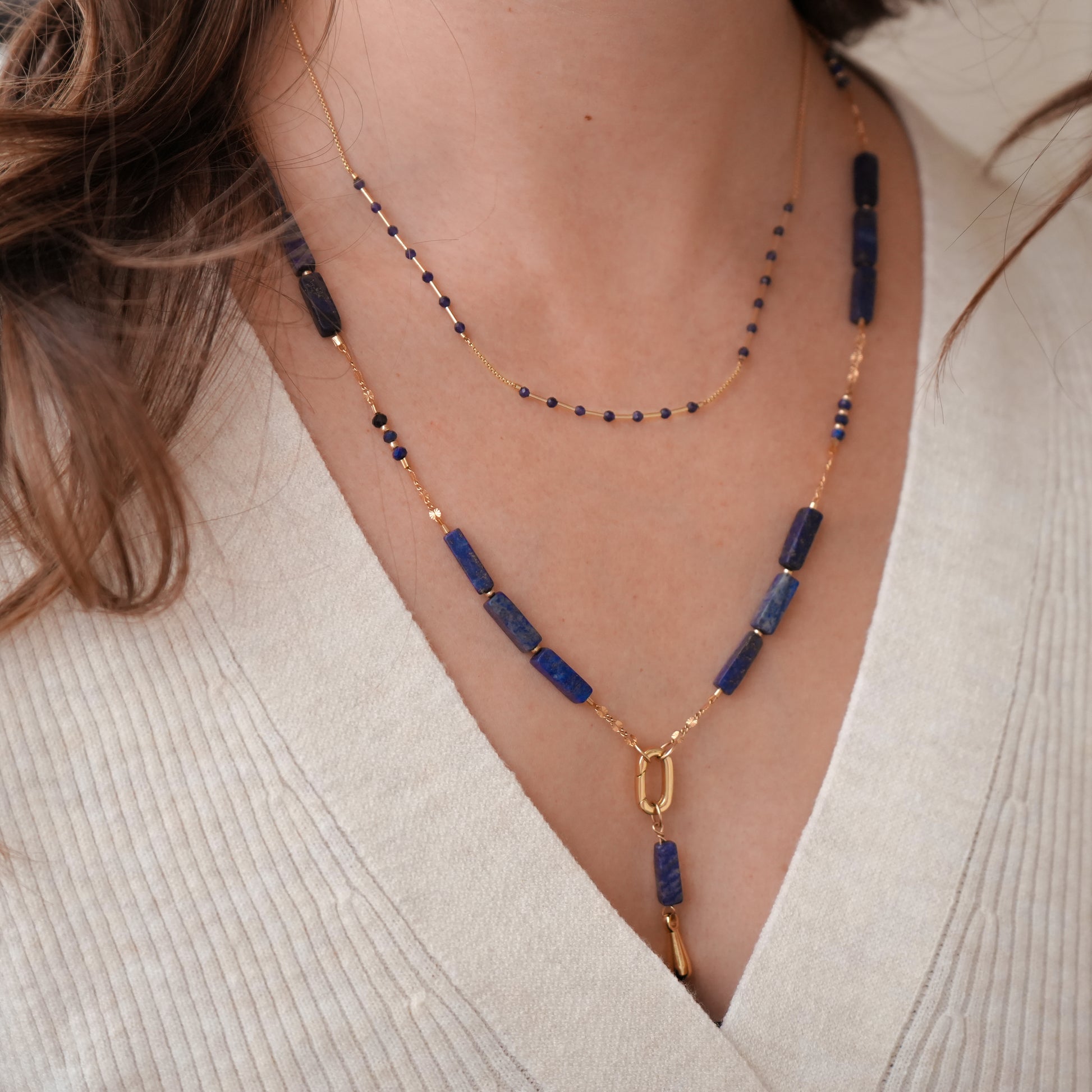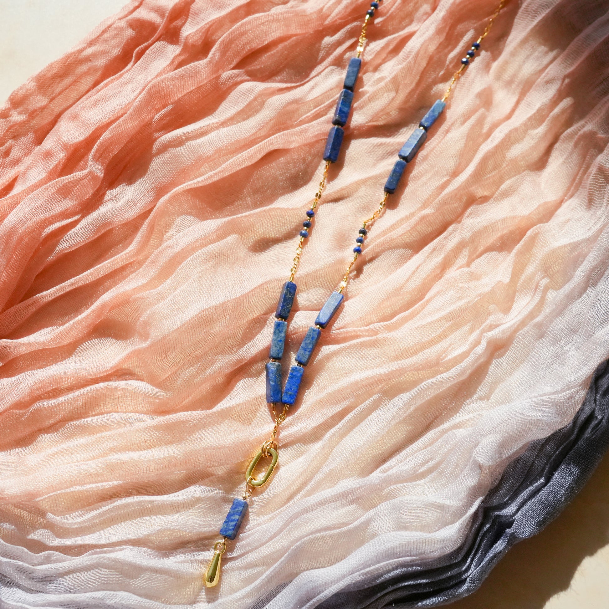Dive into the opulence of the La Mer Necklace. Let the waves of the ocean embrace you with this stunning piece, adorned with rich lapis lazuli stones (a deep, indigo colored stone symbolic of wisdom) and a teardrop charm. There are moments inspired by the glistening sparkle of the water and this necklace will transport you to a world of being seaside and smelling the ocean breeze.