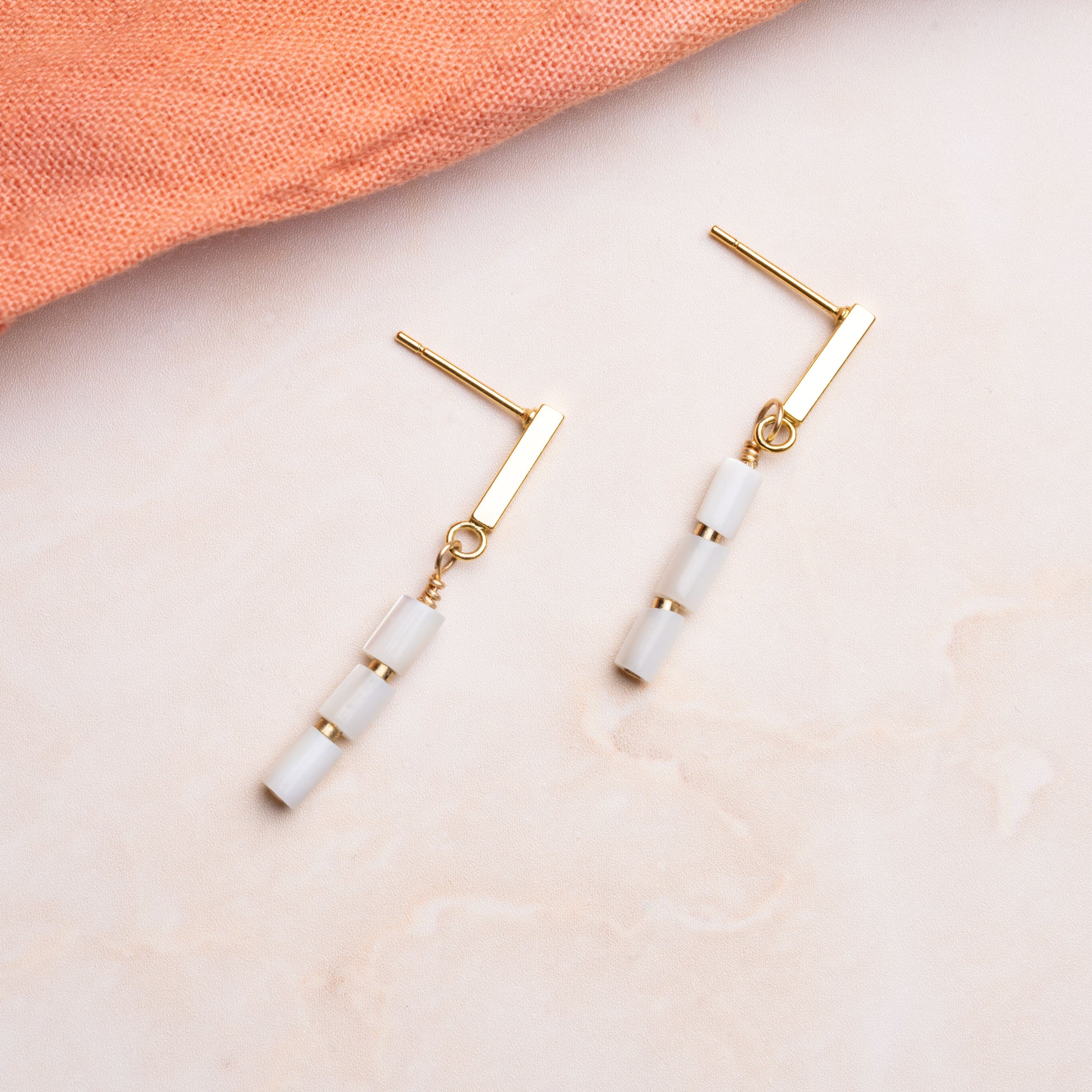 Three mother of pearl tube beads combined with 14k gold-filled findings drop from vertical 14k gold-filled posts, streamlining one's daily style in an instant. Due to the natural pearl materials, no two pieces will be alike.