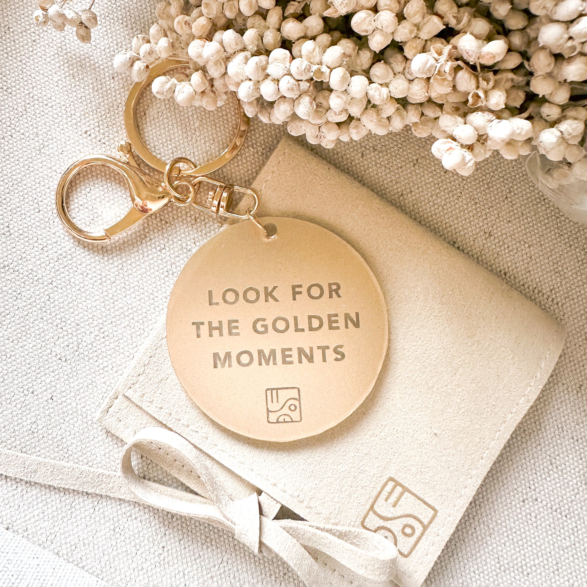 Never was a reminder so clear to cherish the good times or see the positive side of every situation. The perfect accessory for your keys or bags, it symbolizes your daily mantra of positivity and gratitude. Let this keychain be a reminder to Look for the Golden Moments.
