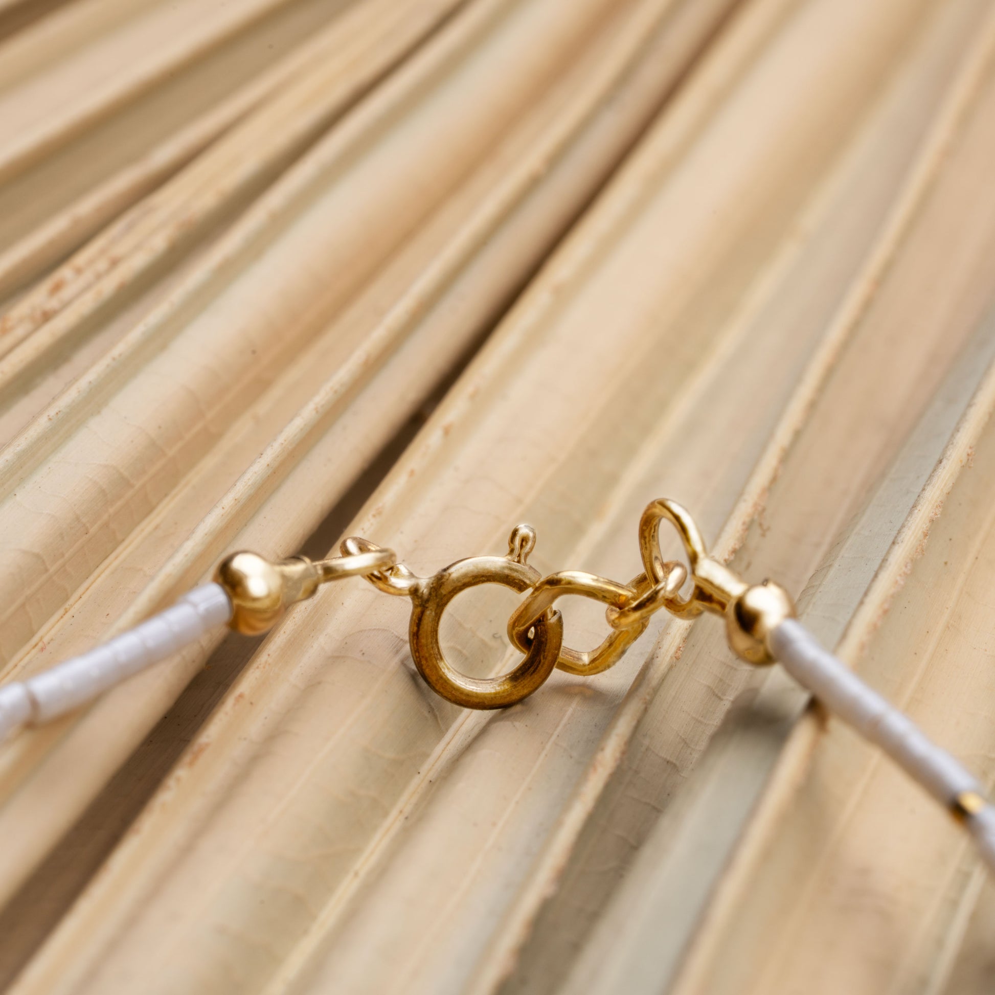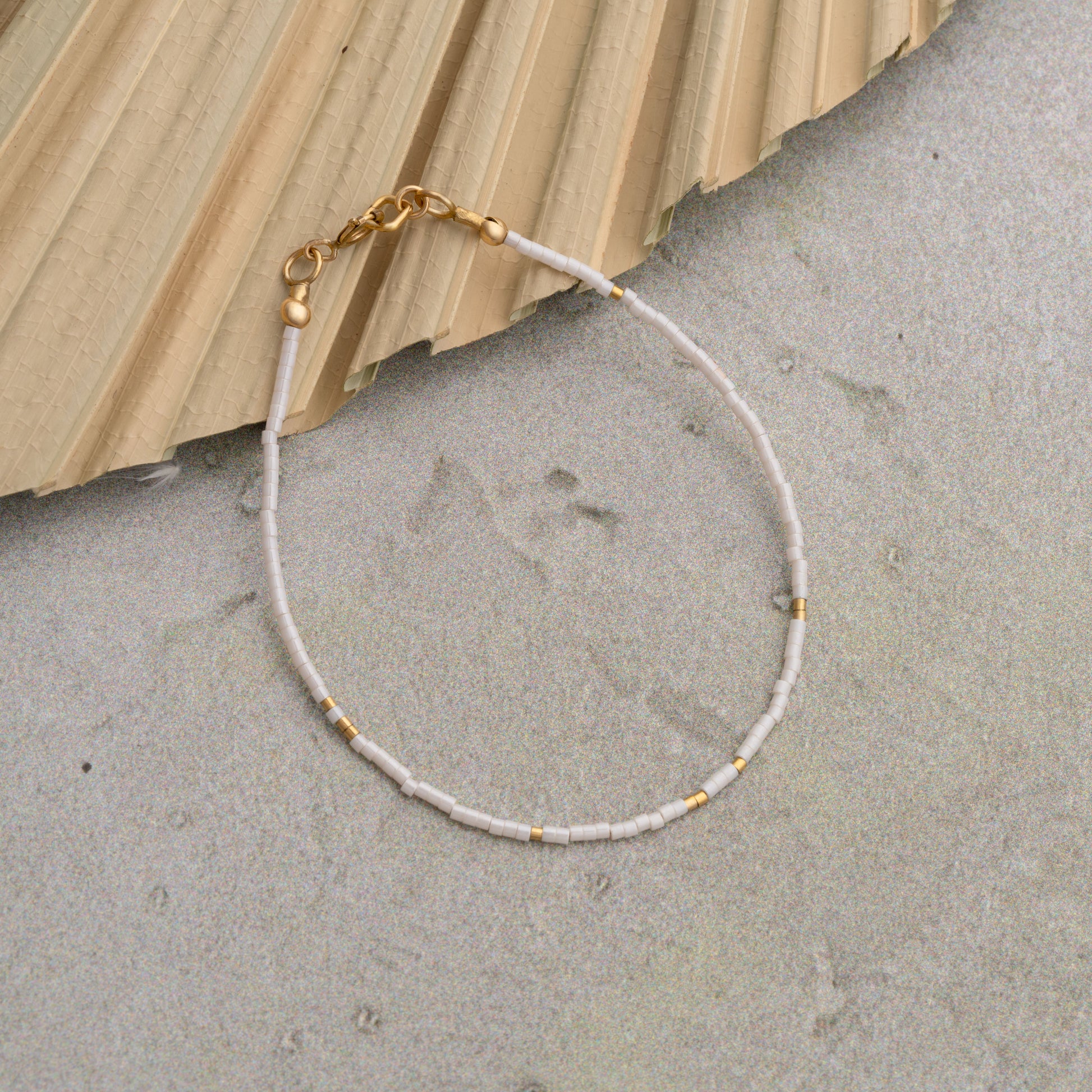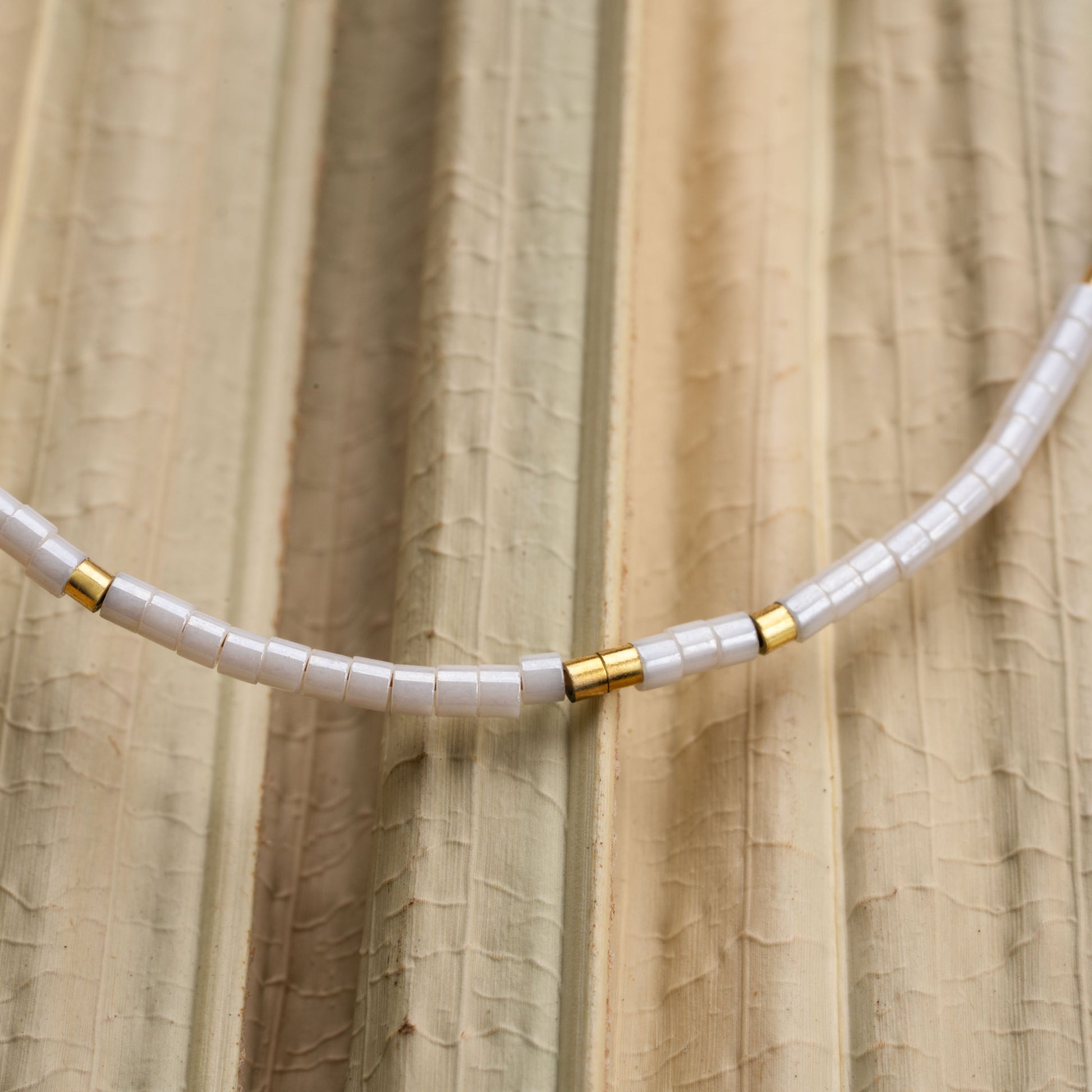 This mini white and bright bracelet reminder for Mindfulness is the sister to the Reflection bracelet. A single strand of Miyuki glass beads is artfully interspersed with 14k gold filled findings.