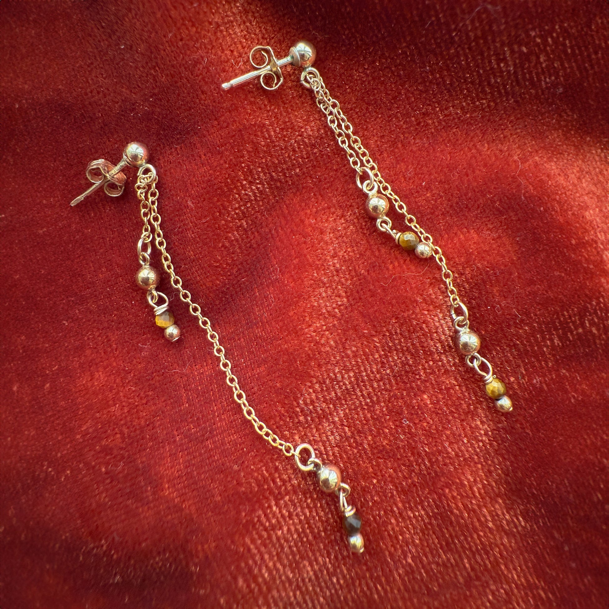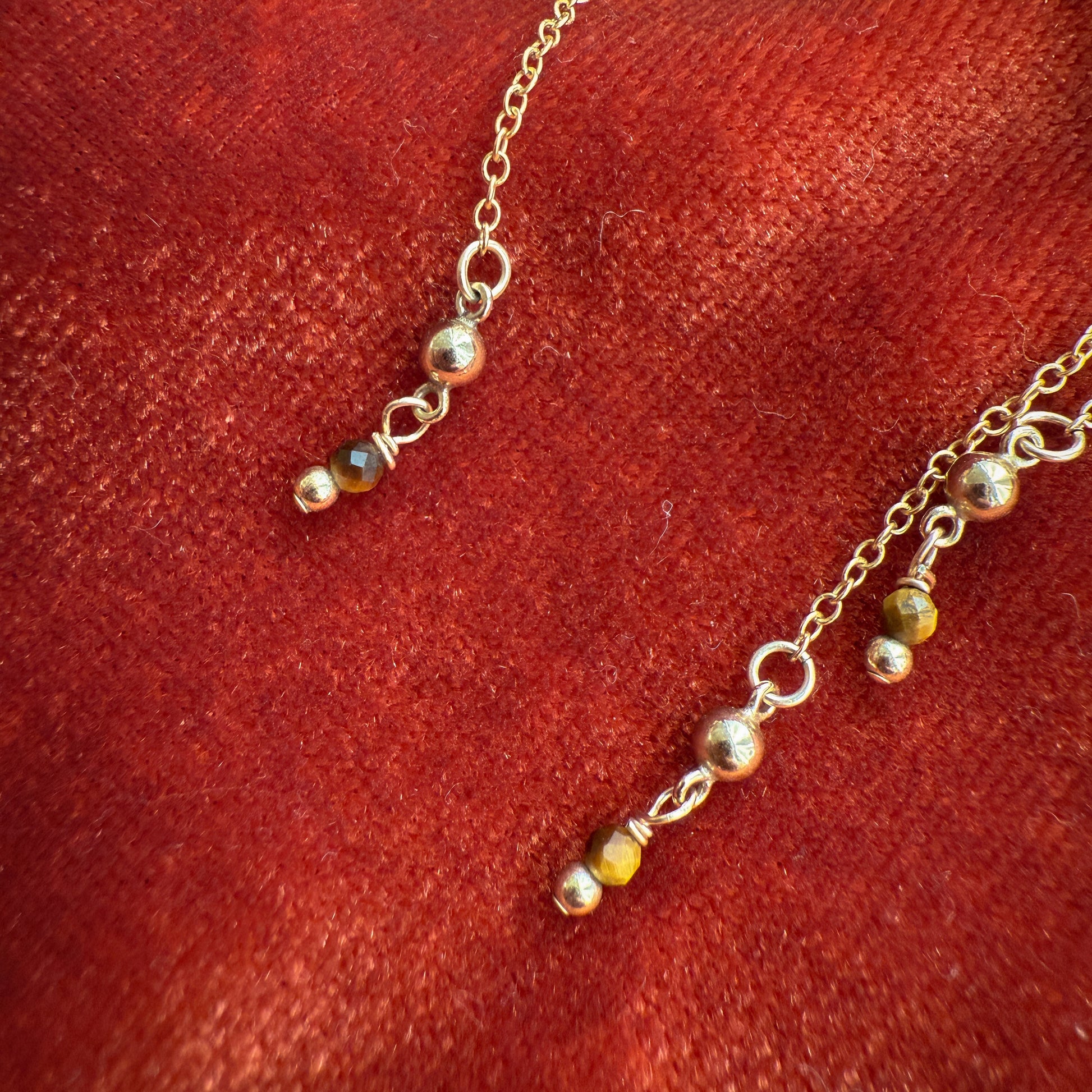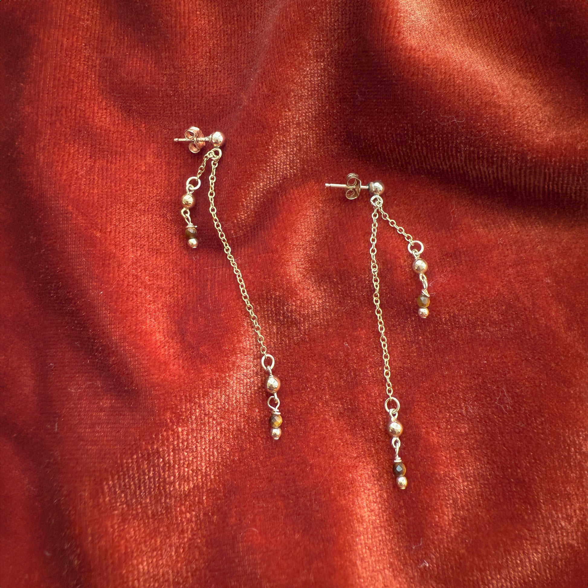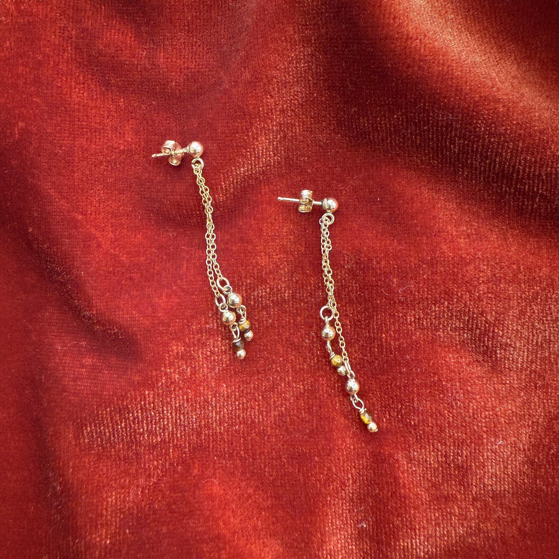 With the Opportune Earrings, allow yourself to feel reassured that you're in the right place at the right time. This pair of earrings features a ball stud post with a movable chain detail adorned with tiger’s eye beads and gold-filled balls. The playful silhouette allows you to adjust the length, creating a unique and versatile look. Let these earrings remind you that you’re in control of your destiny and be open to opportunities that may come your way.