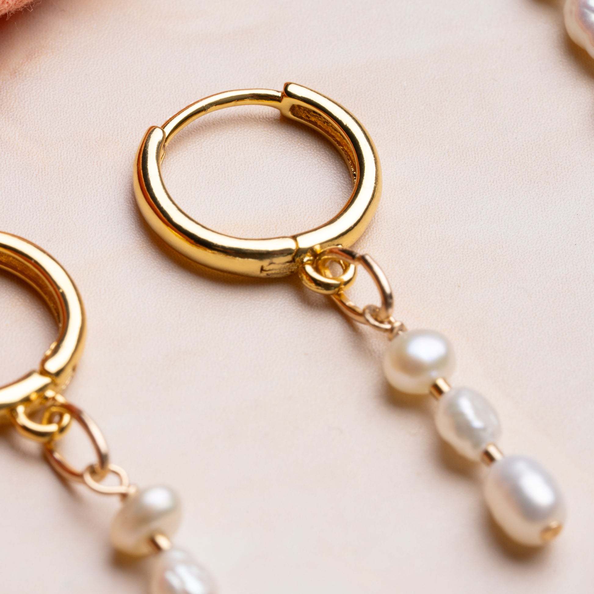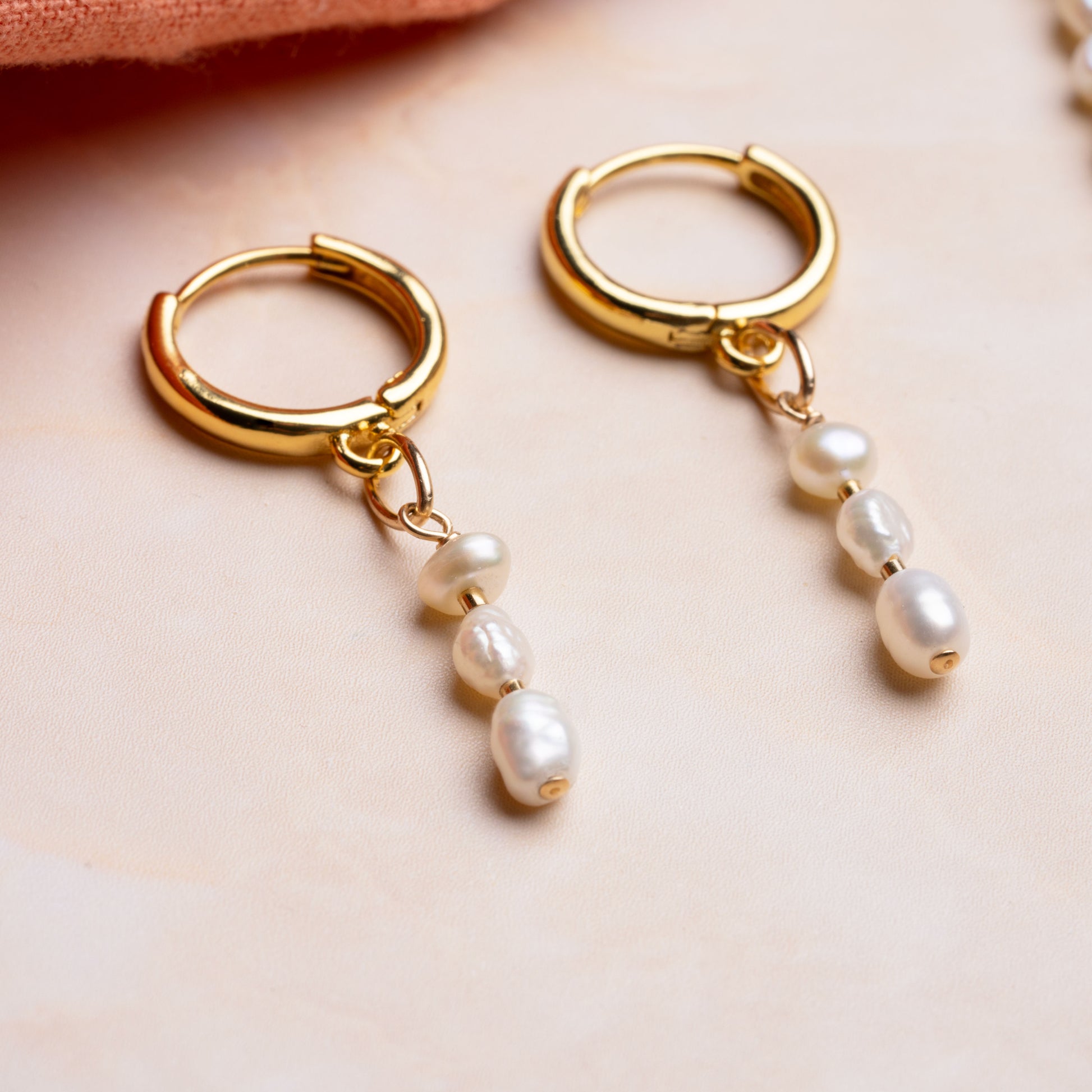 Three freshwater rice pearls combined with 14k gold-filled findings drop from simple hoops, elevating any daily style in an instant. Due to the natural pearl materials, no two pieces will be alike.