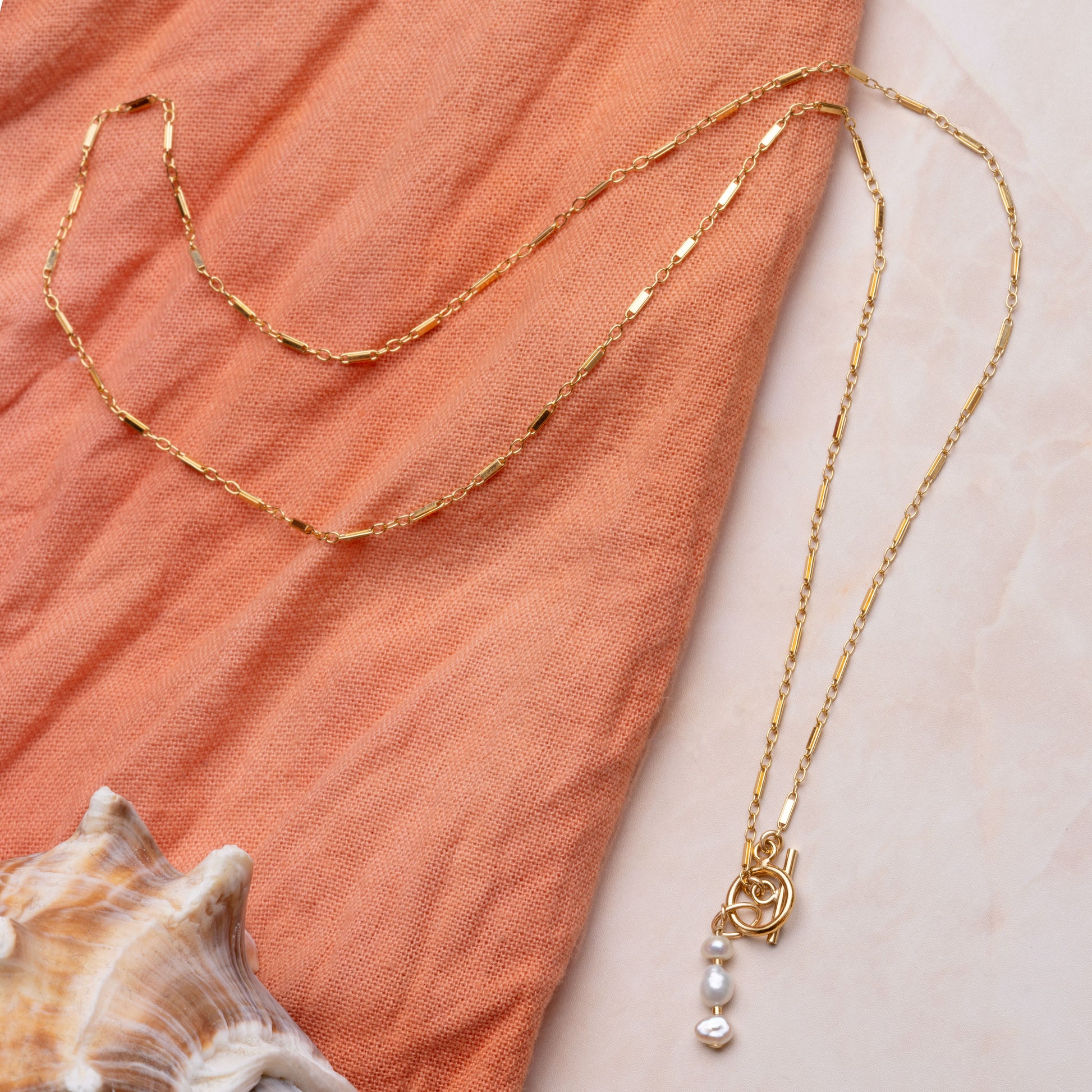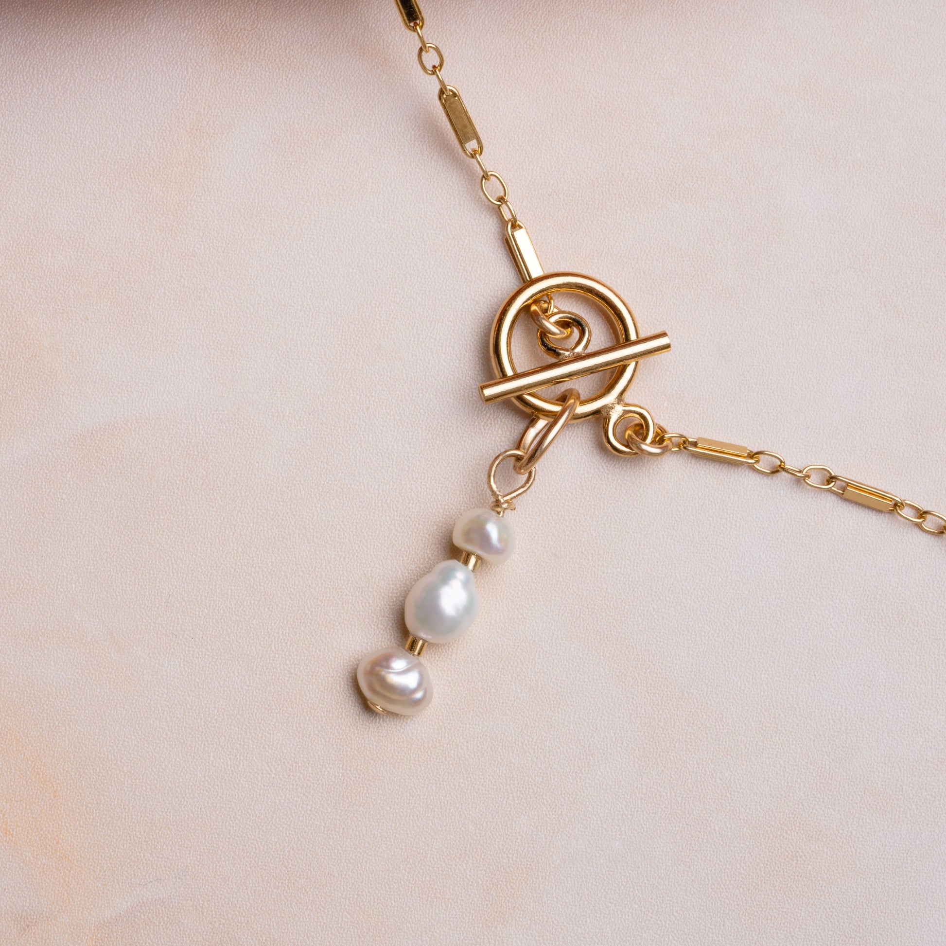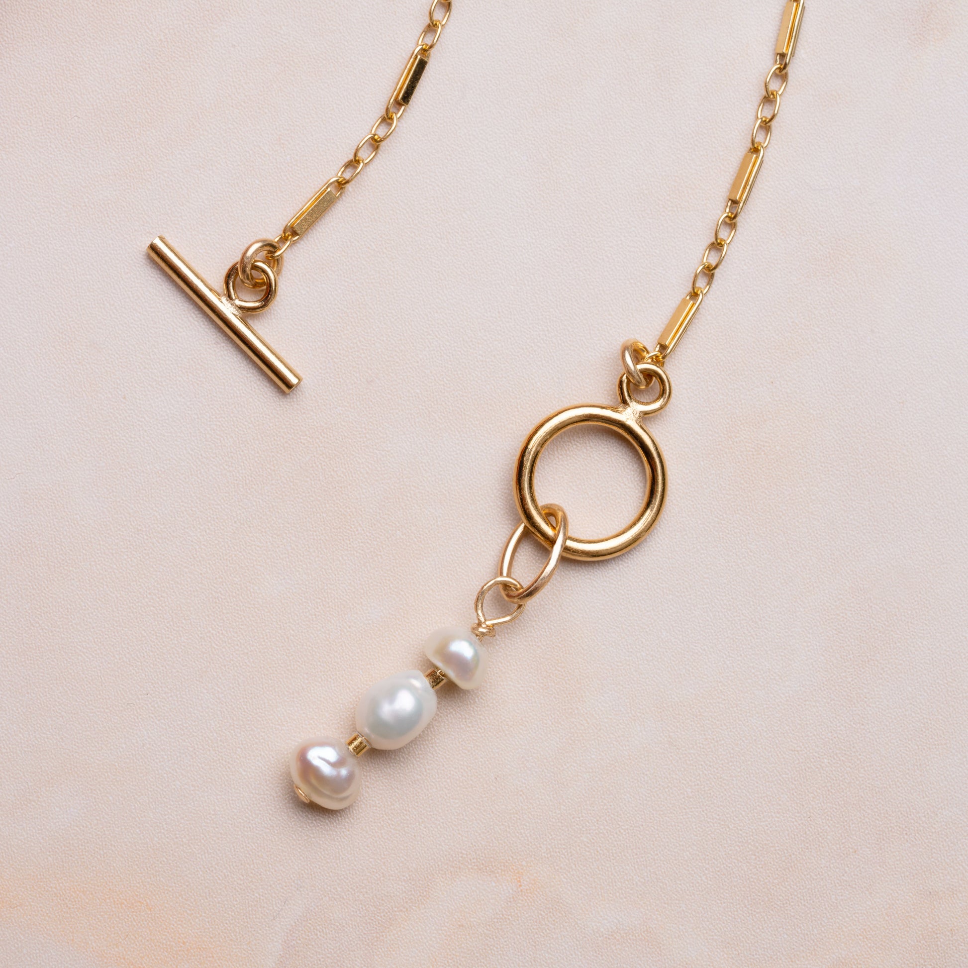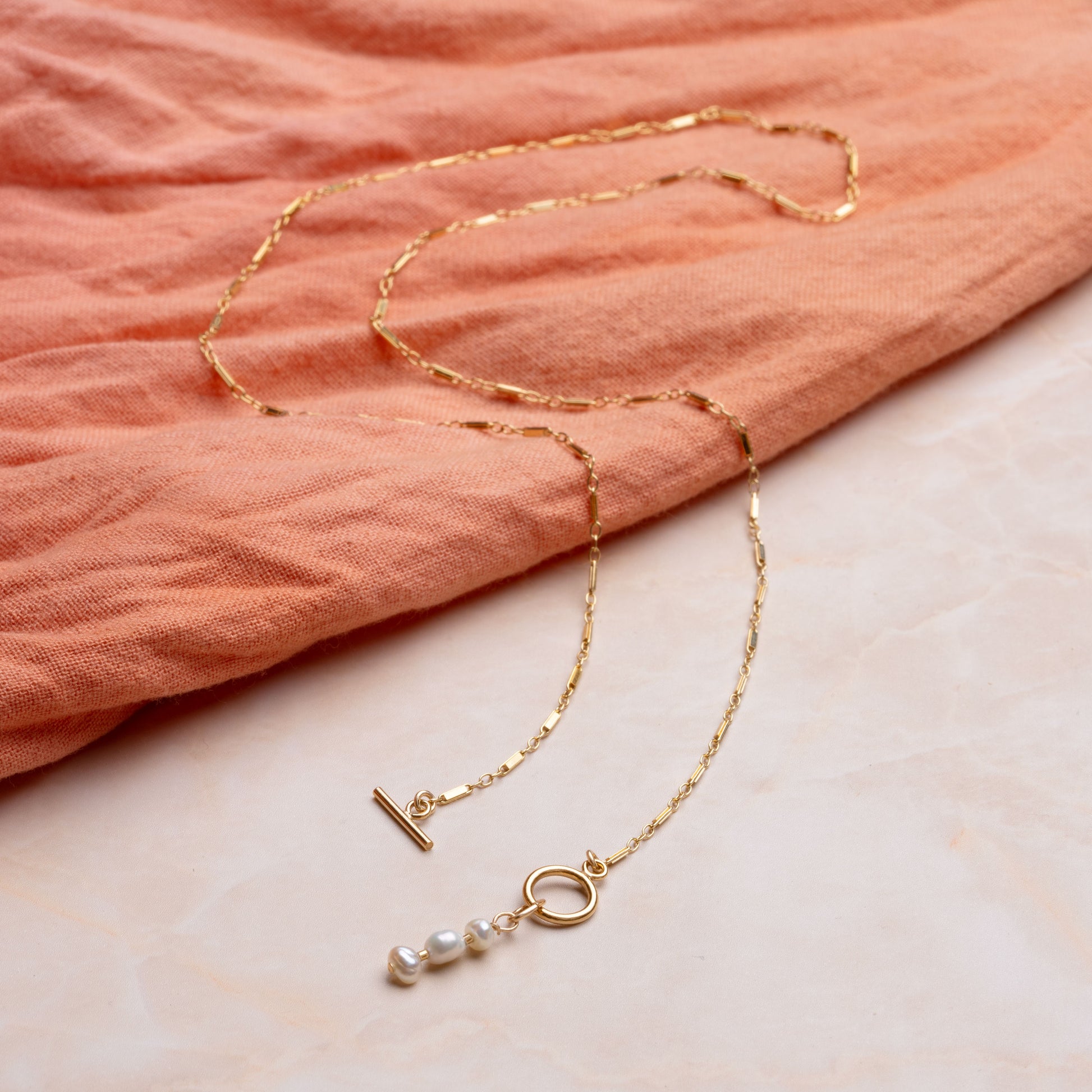 Keep pearls of wisdom given to you close to your heart with this front toggle closure necklace featuring a charm with 3 pearls. At a 20" length, this simple and elevated piece drapes nicely on its own or pairs well with the Dream Strand necklace.