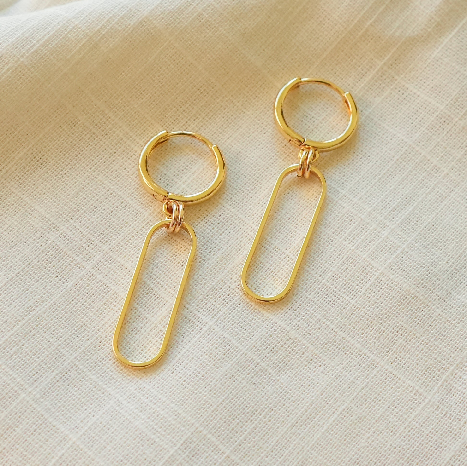 With the Reach Earrings, you can listen for the cues that will help you achieve all that you set your heart and mind to. A single, long, gold link, hangs from a huggie style hoop.