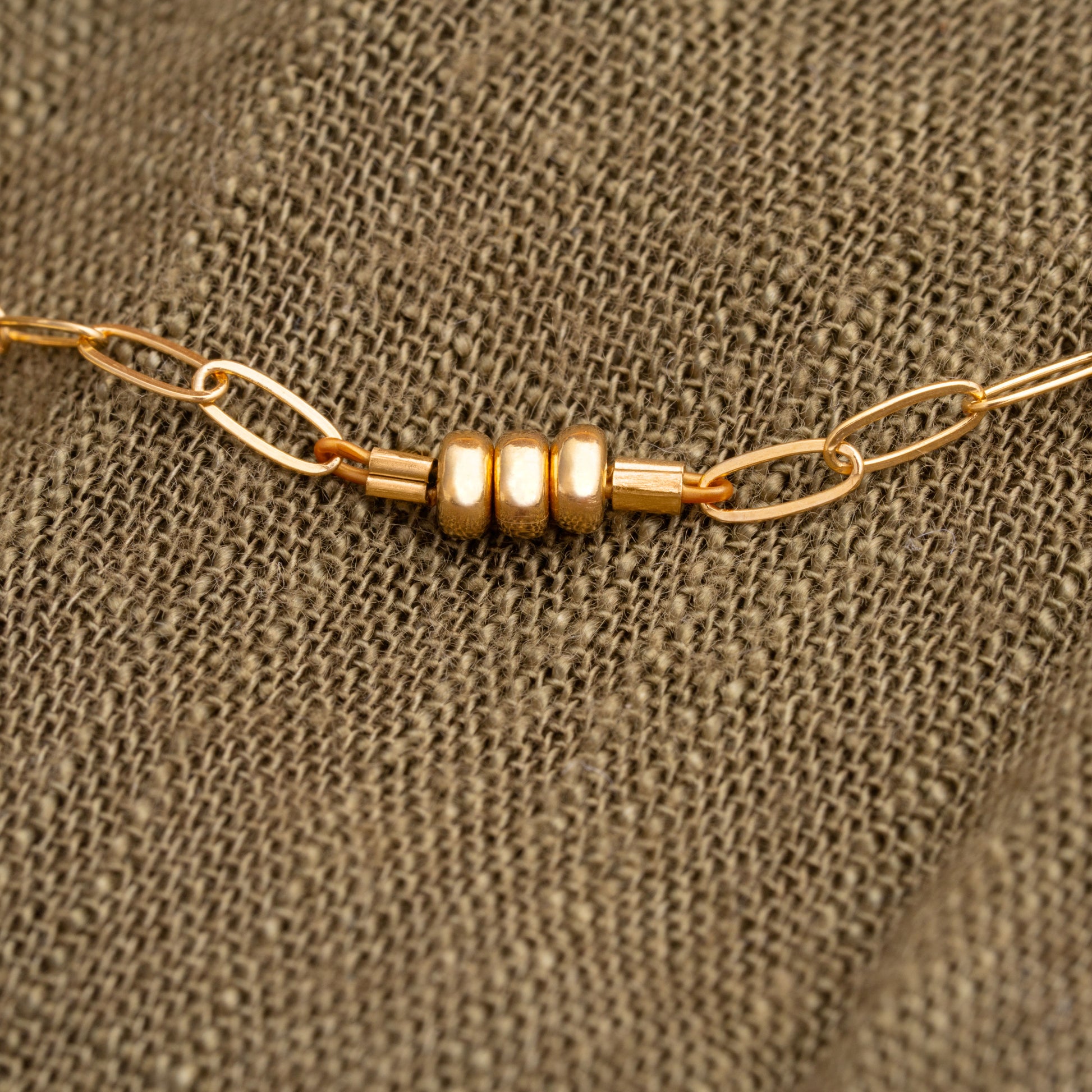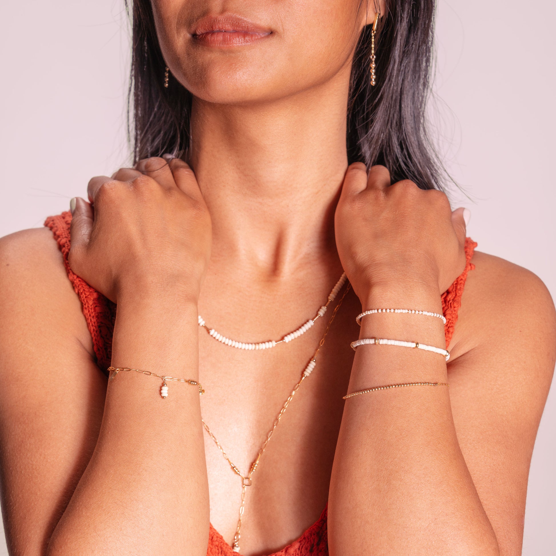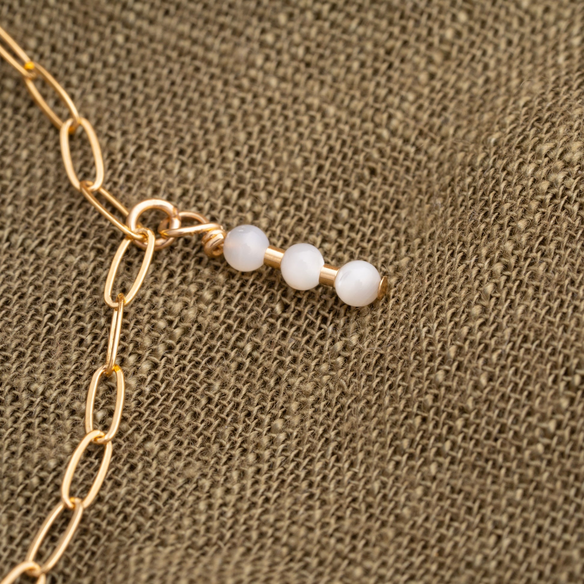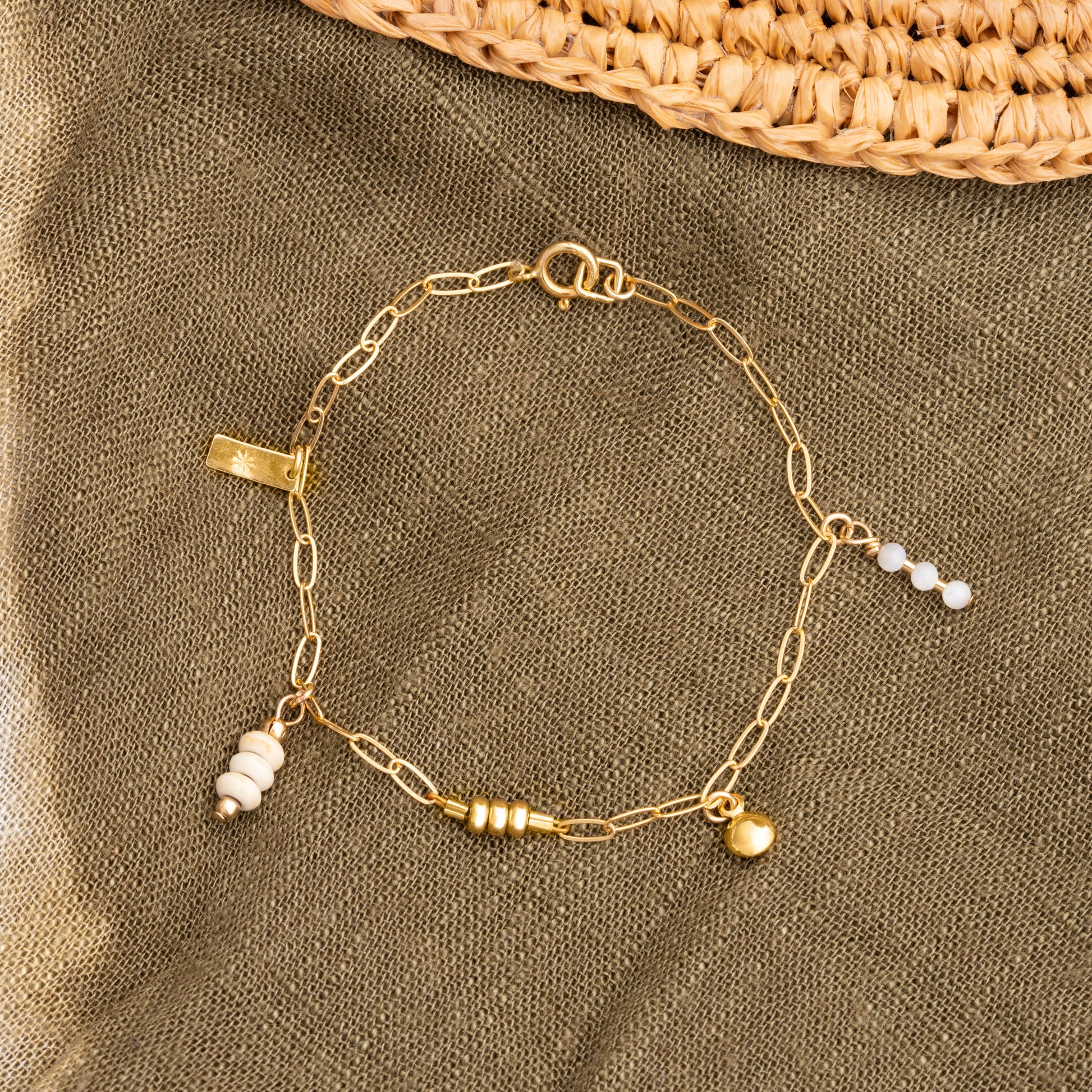 This dainty charm bracelet is 14k gold-filled with stone beads and mother of pearl beads.