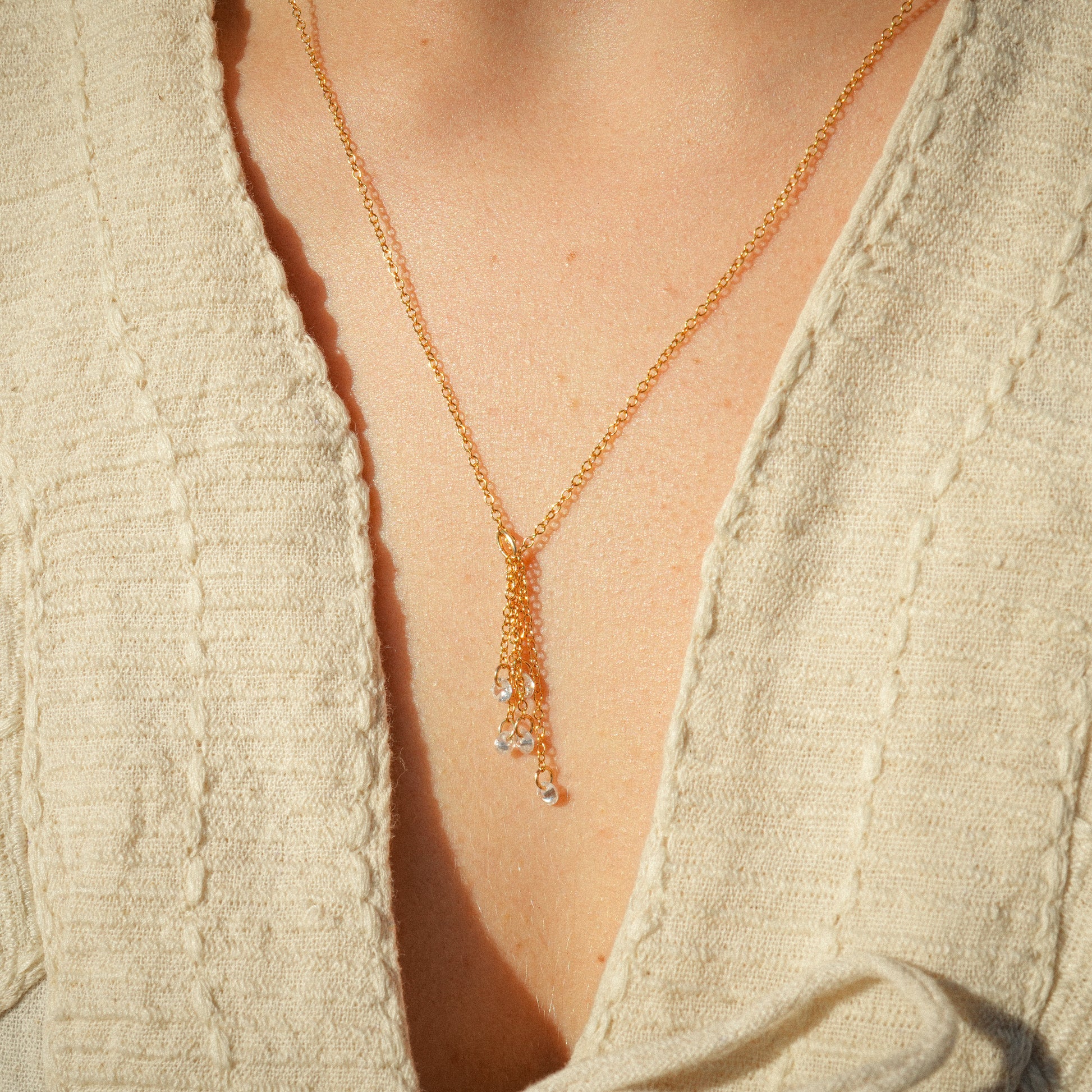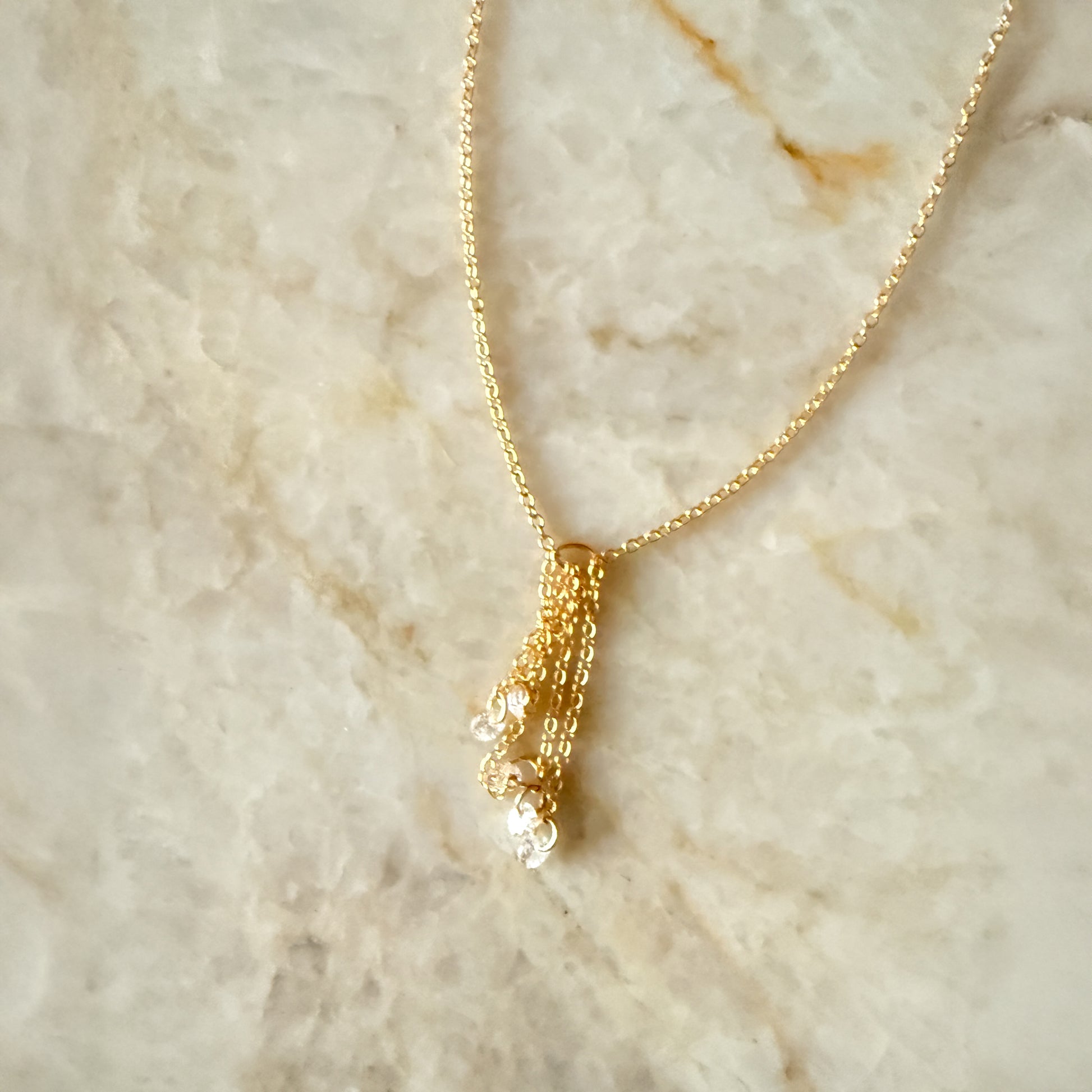 Five, clear cubic zirconia crystals mimic tears falling and are suspended on dainty gold-filled chains.