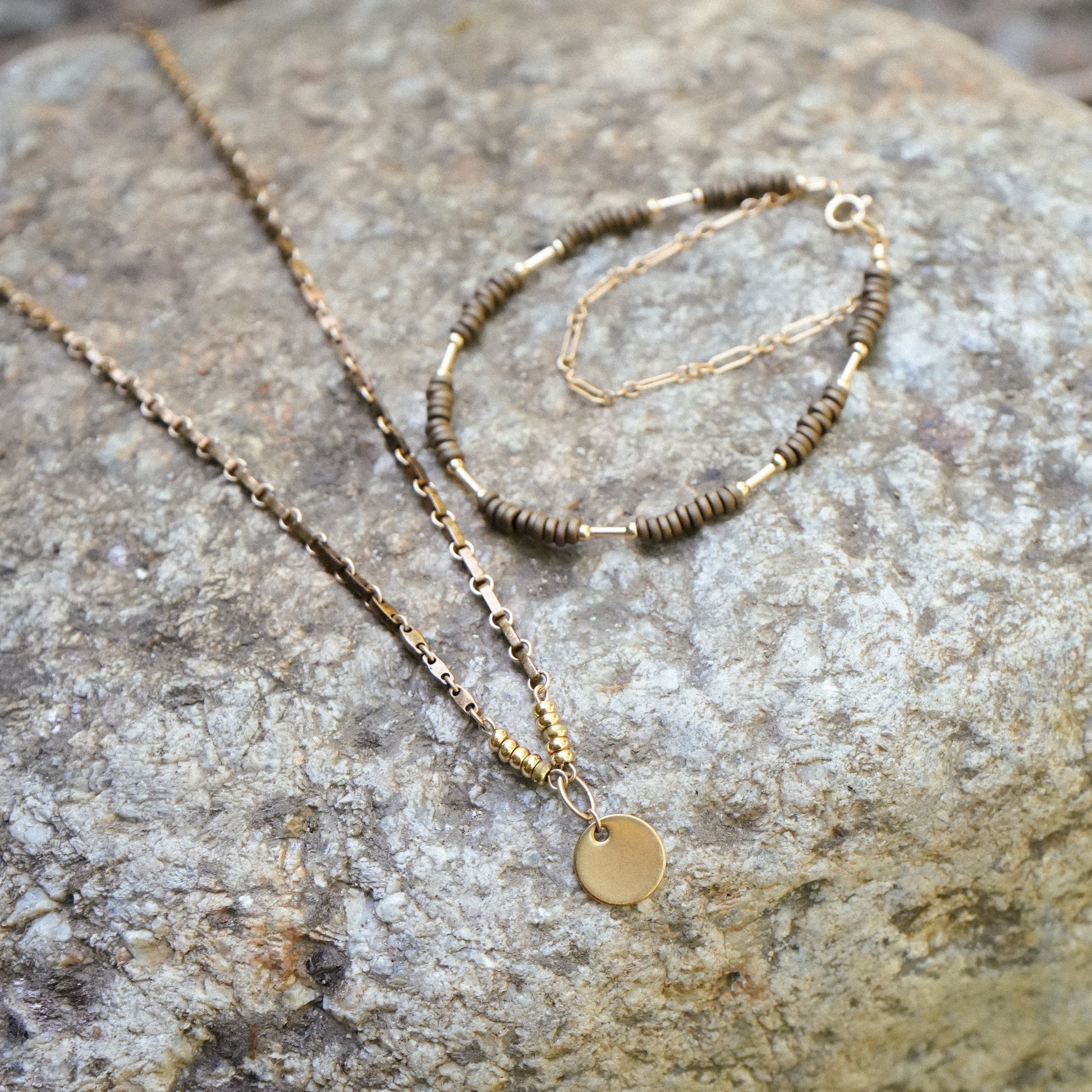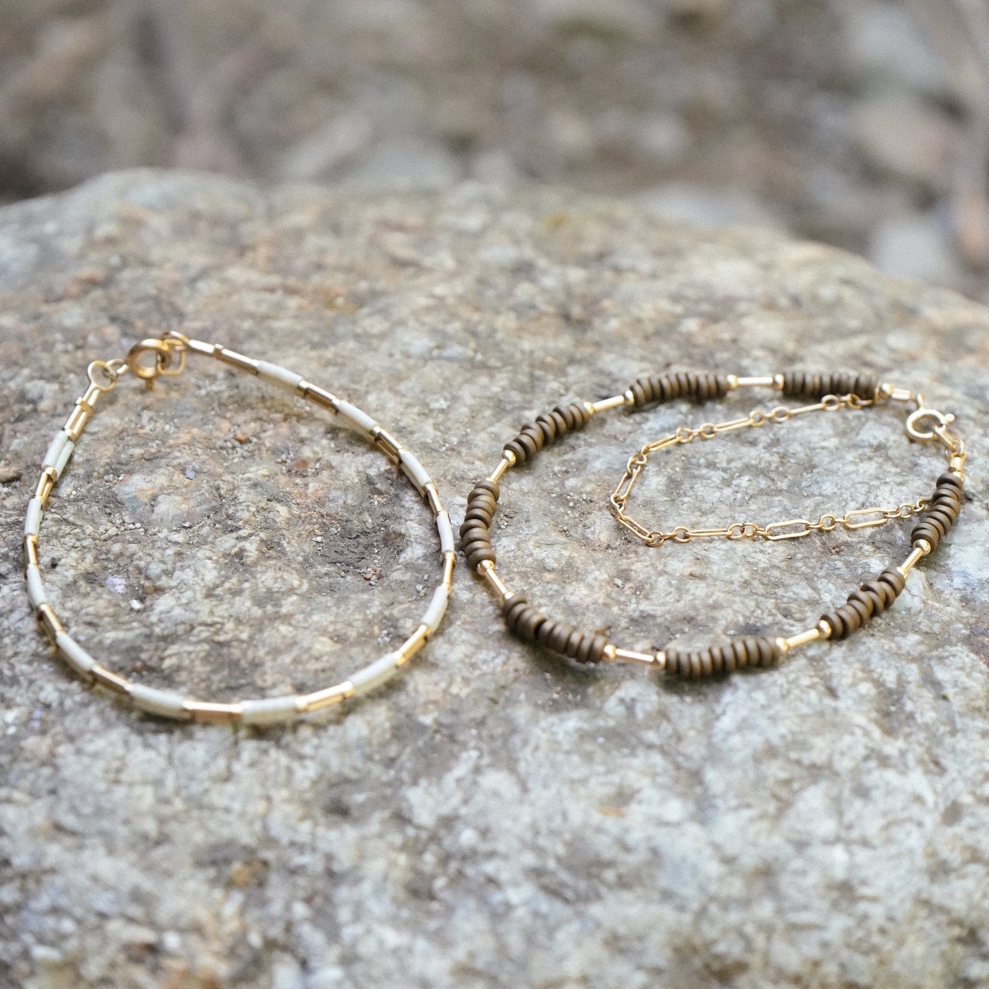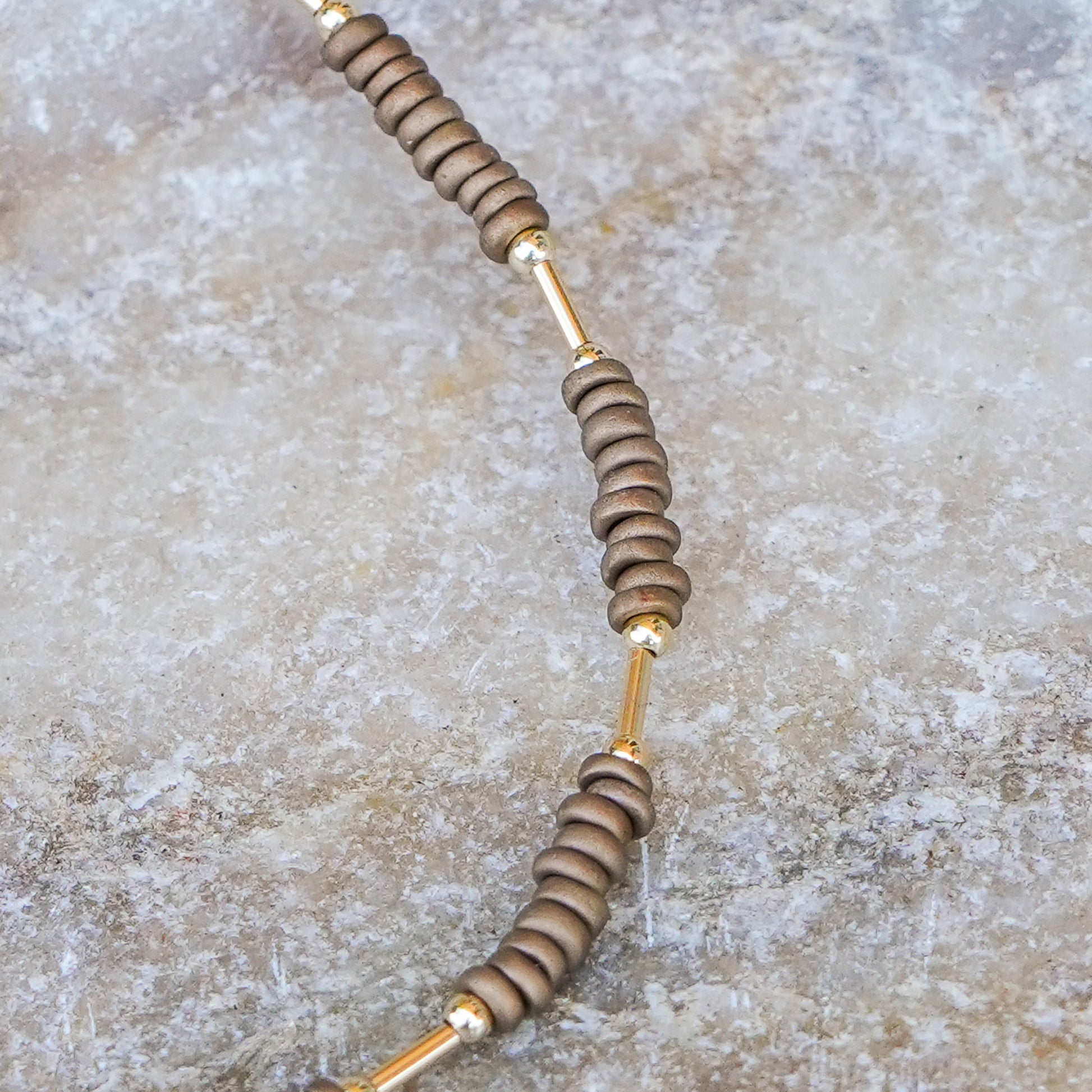 Reflect on your journey with the Rooted Bracelet. Matte bronze colored glass beads punctuated with gold beads and a Victorian era inspired gate chain link design create a timeless piece that evokes the strength of your origins. Let this bracelet serve as a tribute to your roots, symbolizing how far you’ve come and the familiar anchors that have guided you, and will continue to guide you forward.