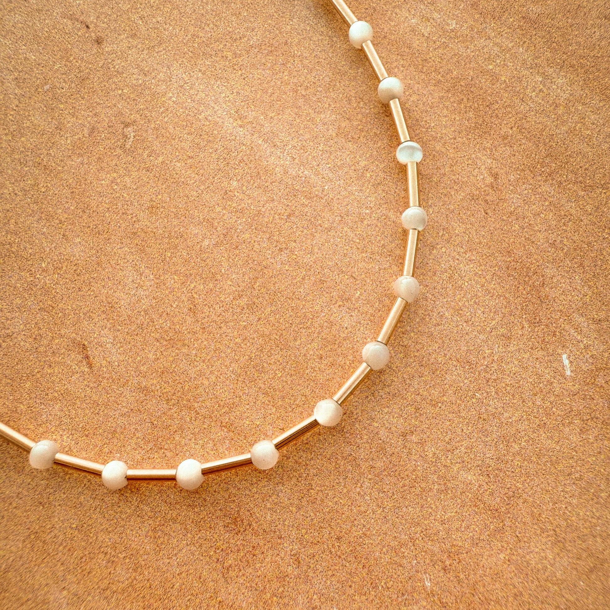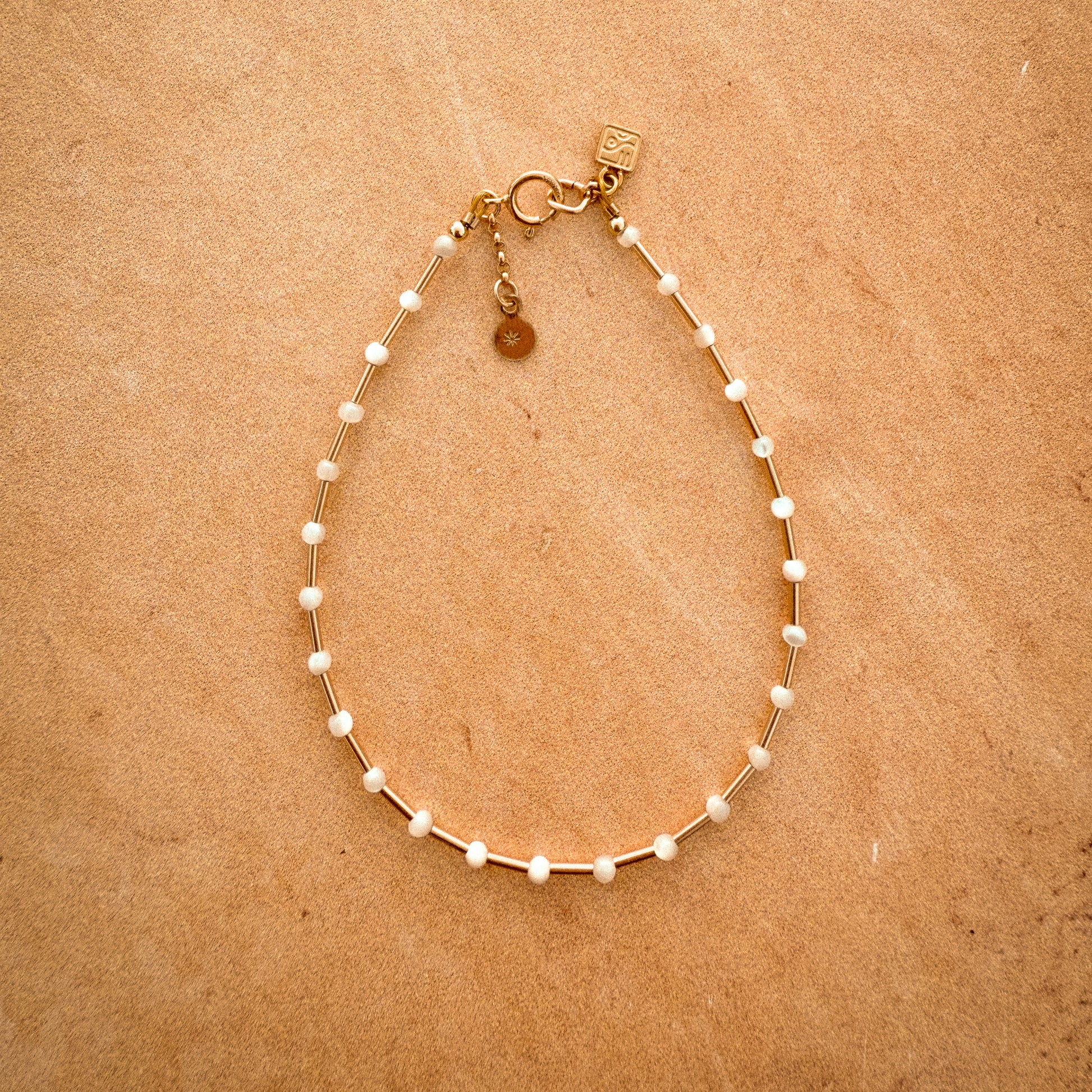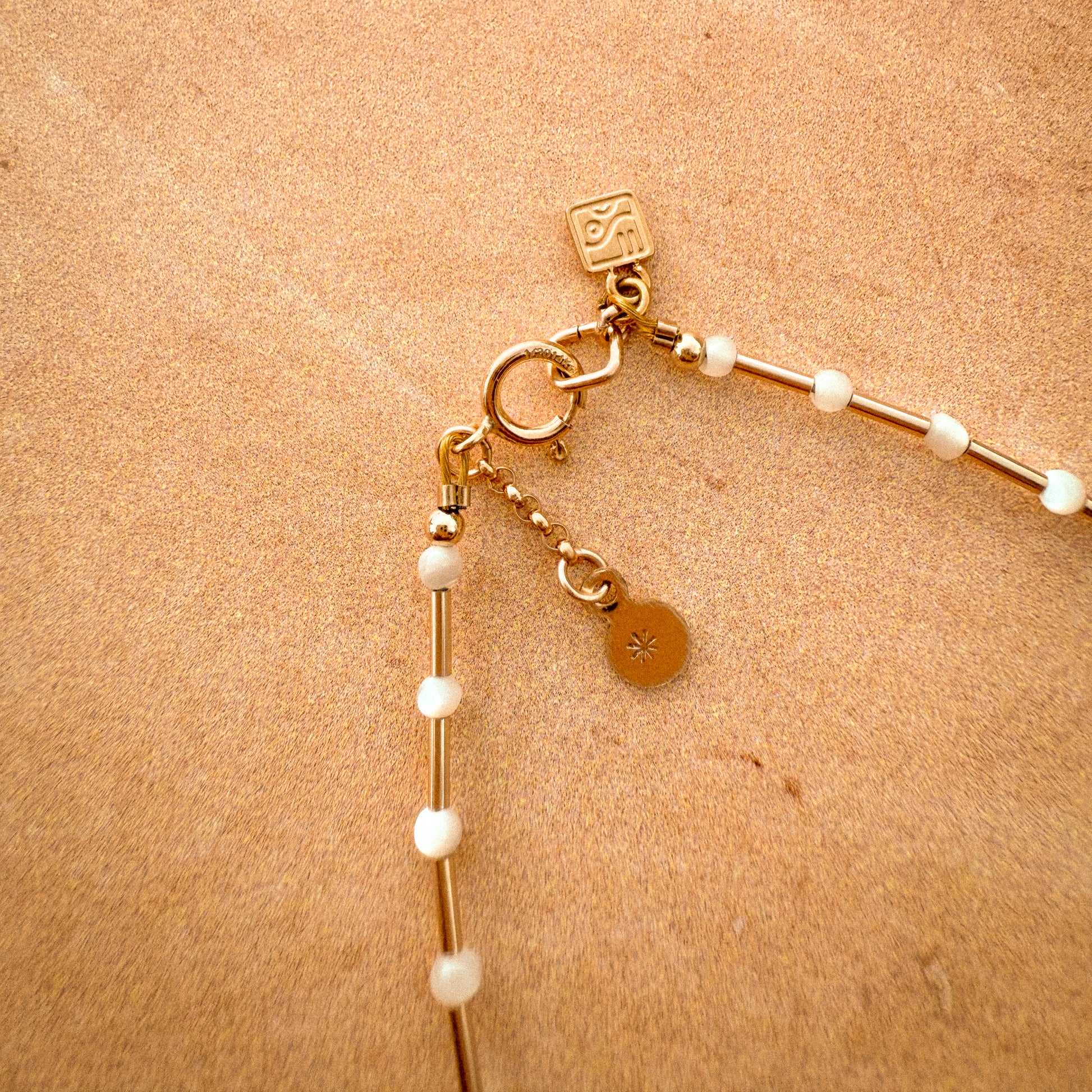 At times we need to prioritize the importance of space - the space to dream, the space to breathe, the space to think. Enter the Space Bracelet, featuring mother of pearl and gold-filled beads that mimic stars in orbit. Designed to complement the Dream Strand choker, it symbolizes the freedom to pursue your dreams and the ability to give them space to unfold. The hand-stamped star charm at the clasp adds a special touch, inviting you to make a wish upon a shooting star.
