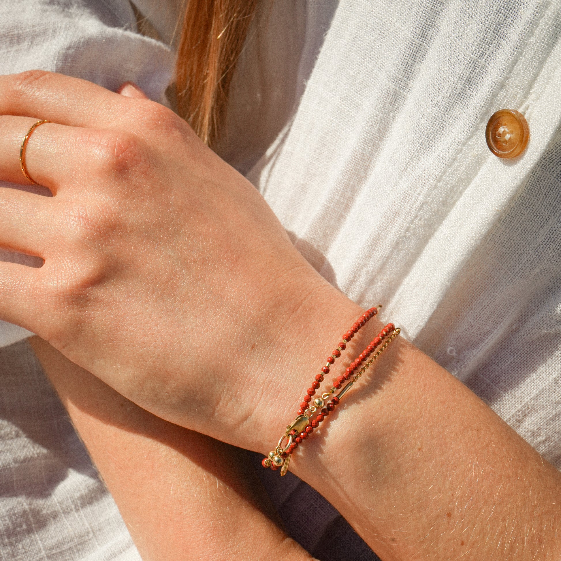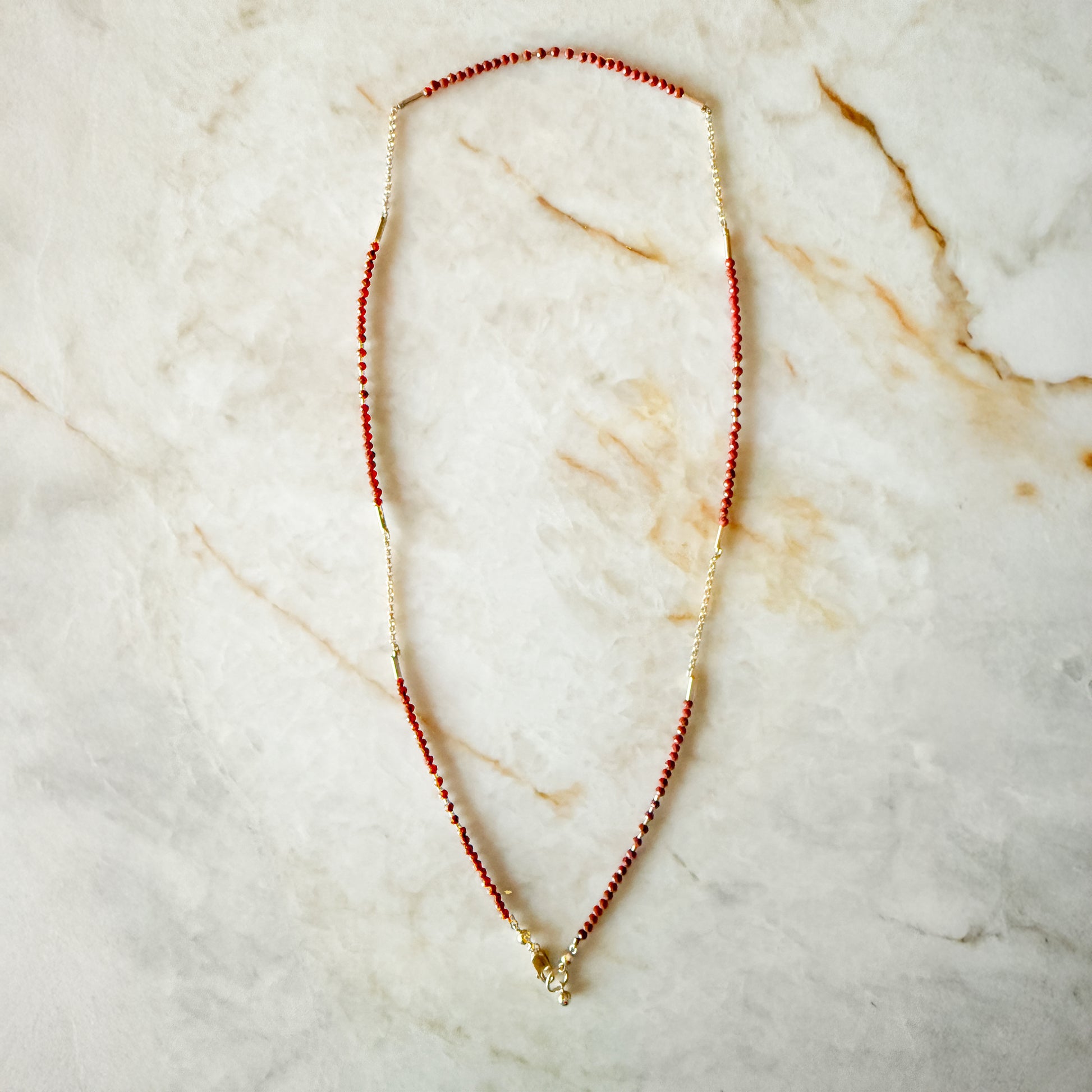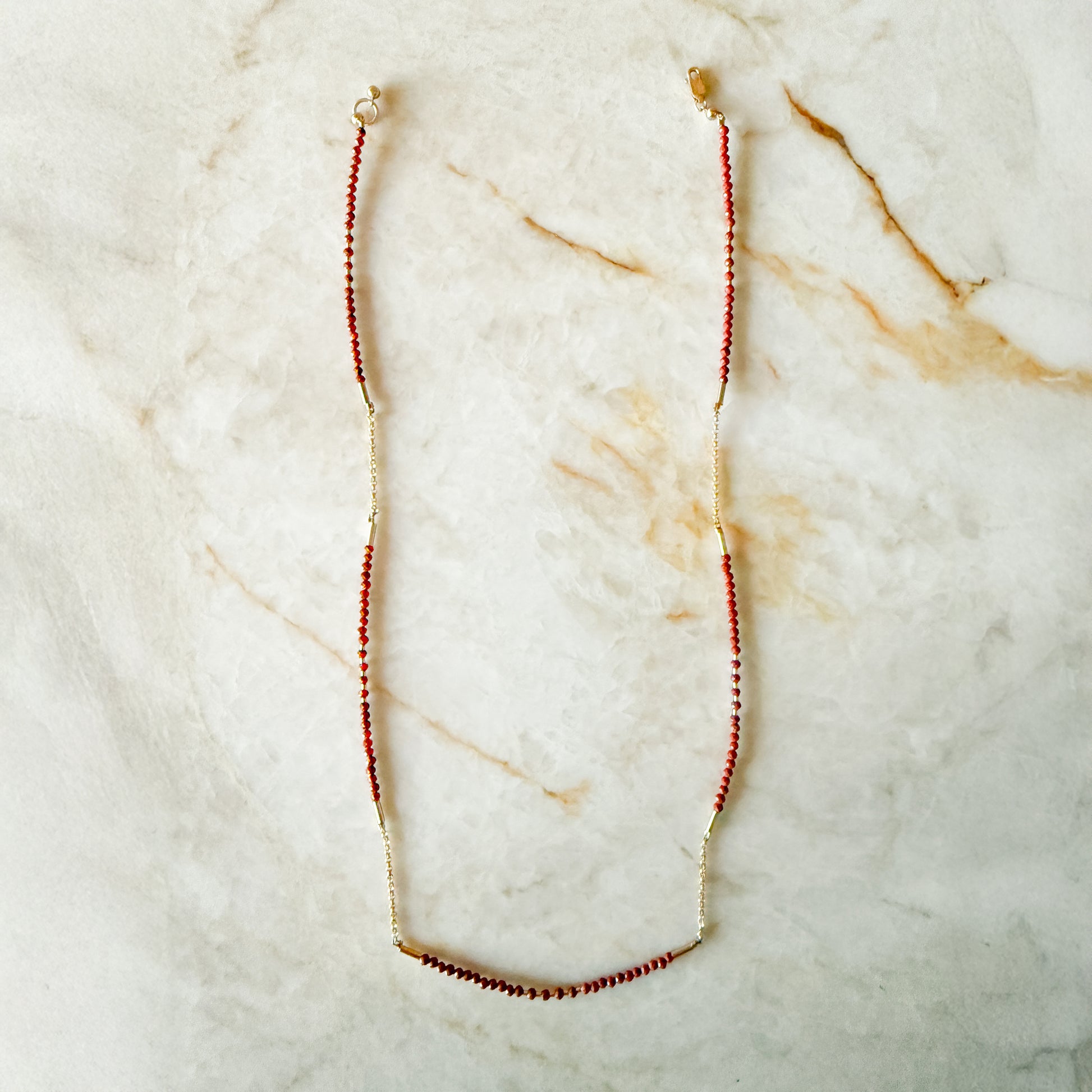 This necklace bears many secrets of its own which only makes the wearer more confident knowing the deeper meaning that lies within its style. It specifically features 130 red jasper beads, a stone of courage, as "130" is an angel number of courage. The secret to this necklace is the versatility in the wear: 2 ways as a necklace and 1 way as a wrap bracelet.