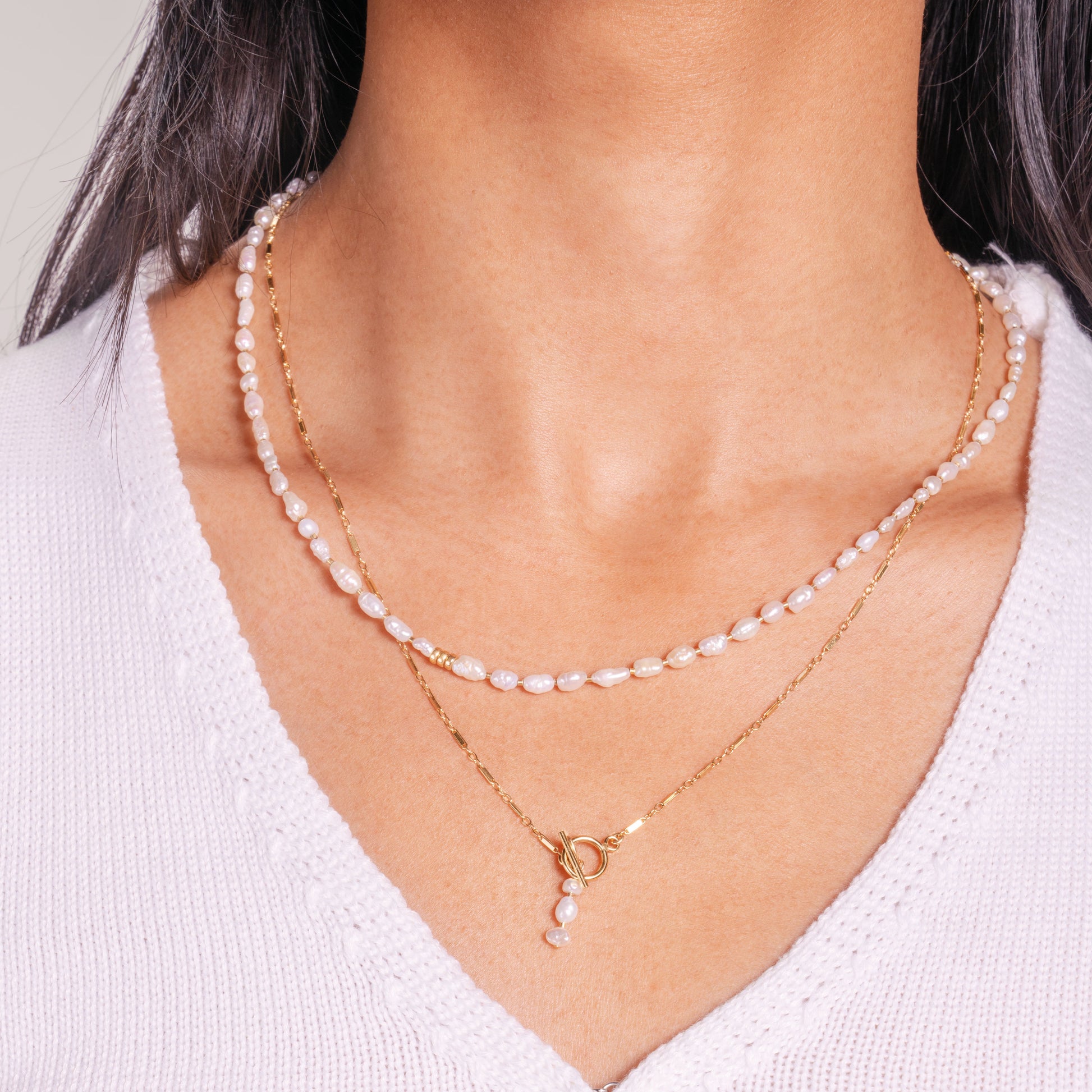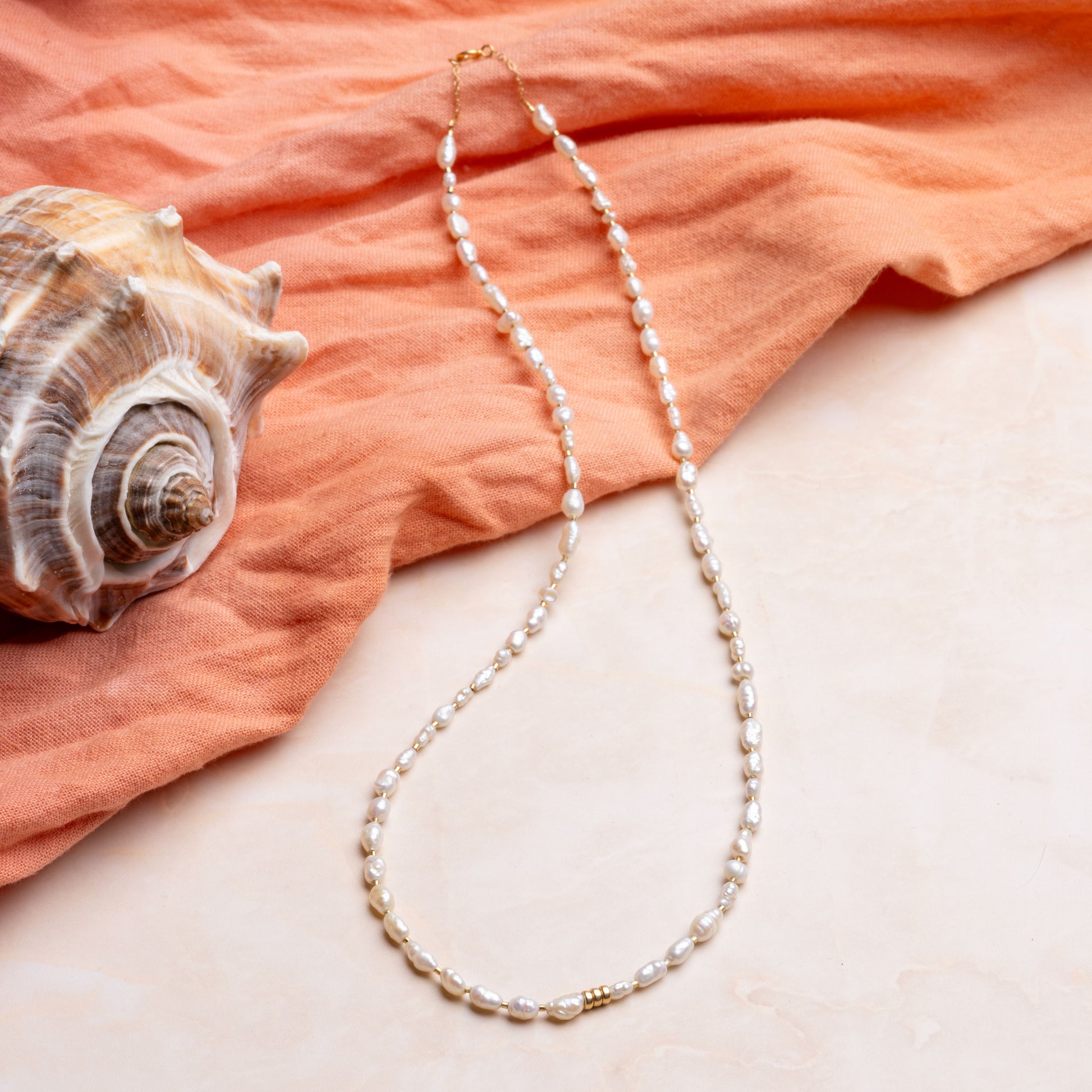 Necklace is 19” of freshwater rice pearls and 14k gold-filled findings. Due to the natural pearl materials, no two pieces will be alike.