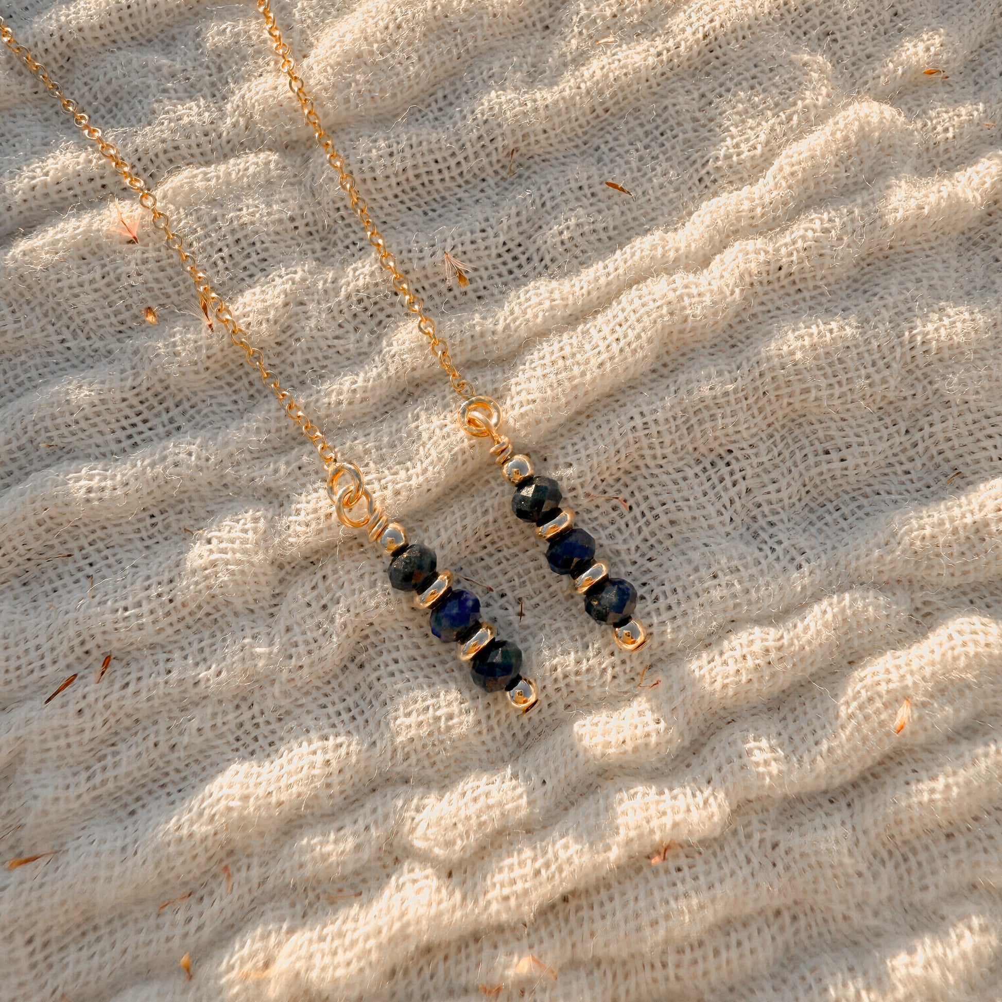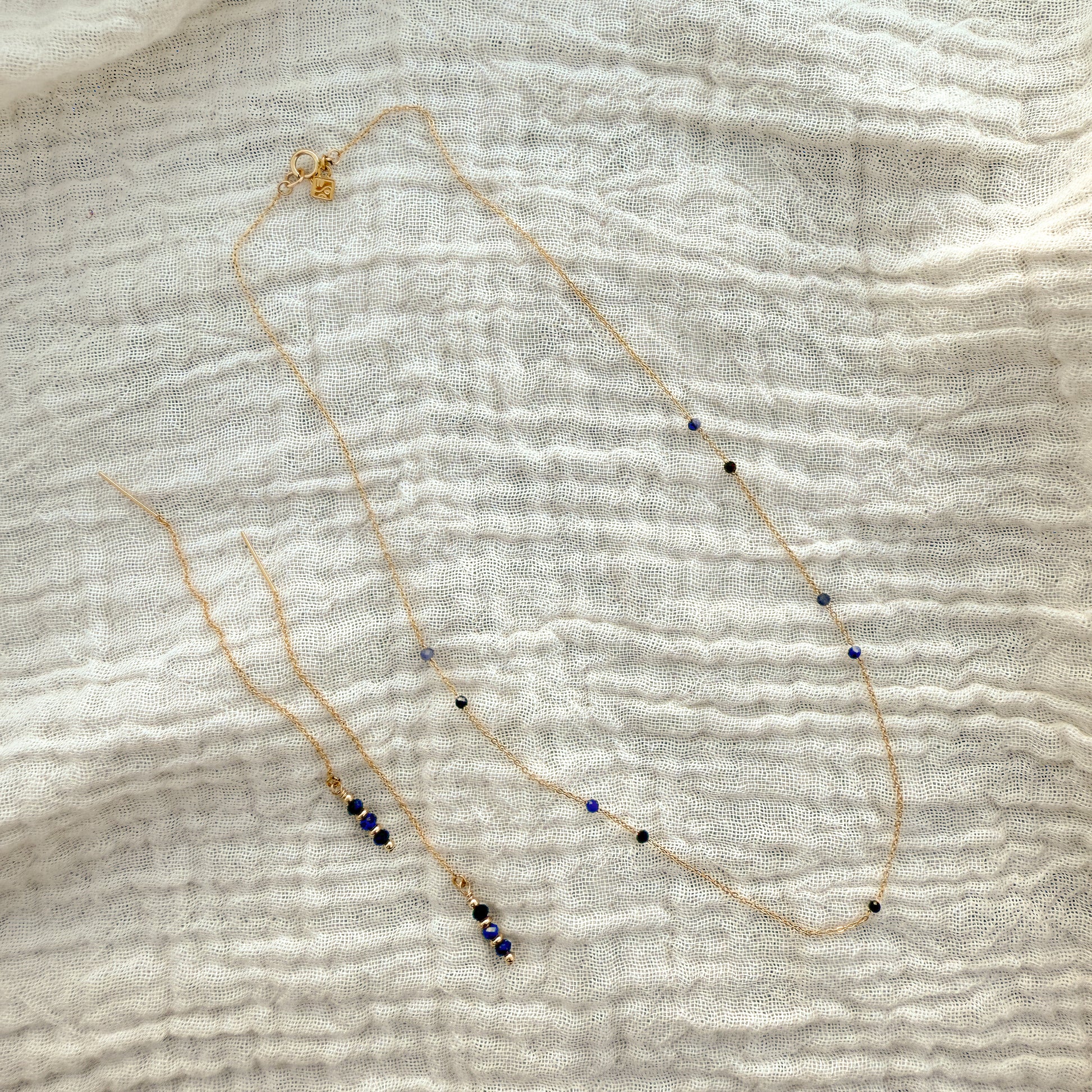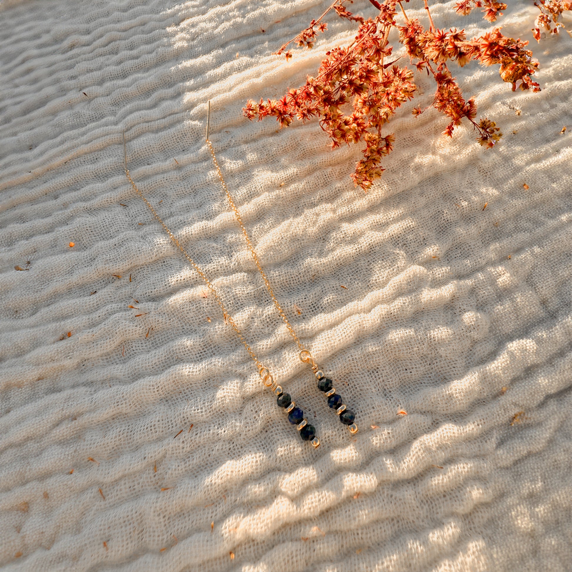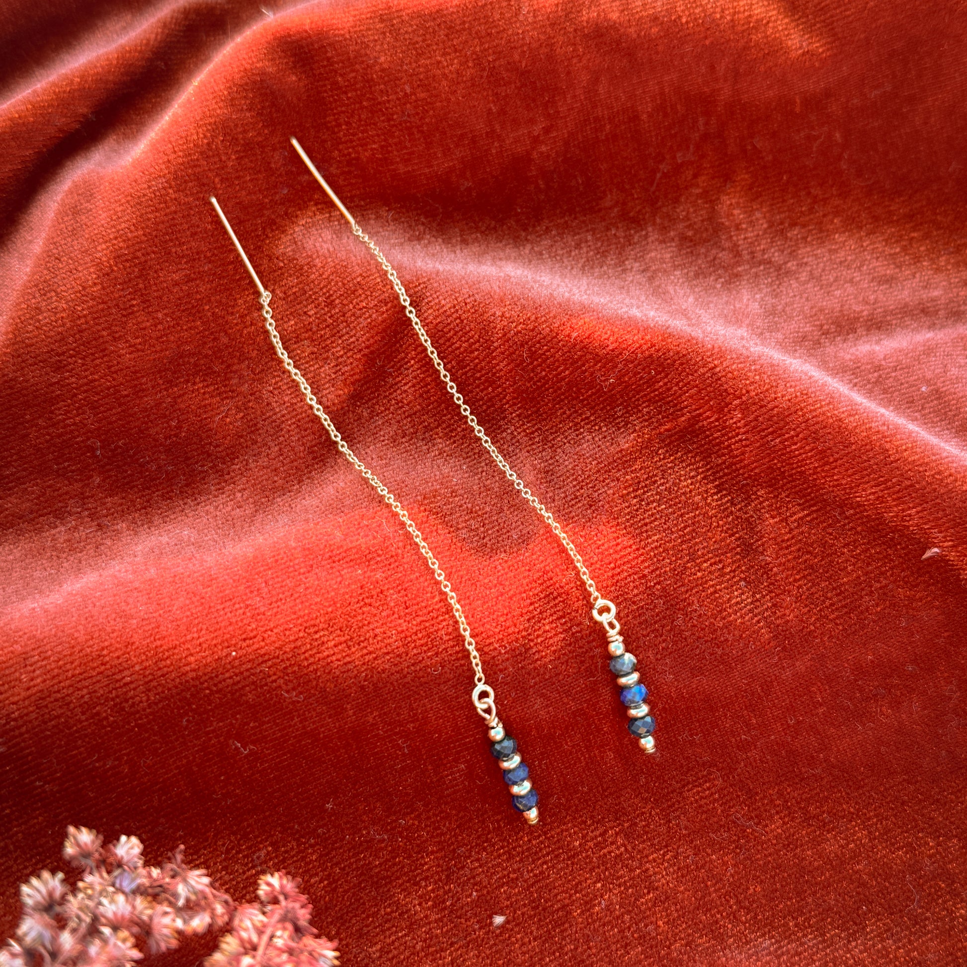 Gently immerse yourself in new experiences with the Wade Earrings on hand, or rather, on ear. These threader style earrings feature triplets of lapis lazuli beads, a semi-precious stone of wisdom, alternating with gold-filled beads. These earrings symbolize the ability to come into a new experience and embrace your surroundings with grace and confidence. Let them be your stylish guide, leading you to the right place, especially as you're able to control how long or how short you'd like the stones to dangle away from your lobes.