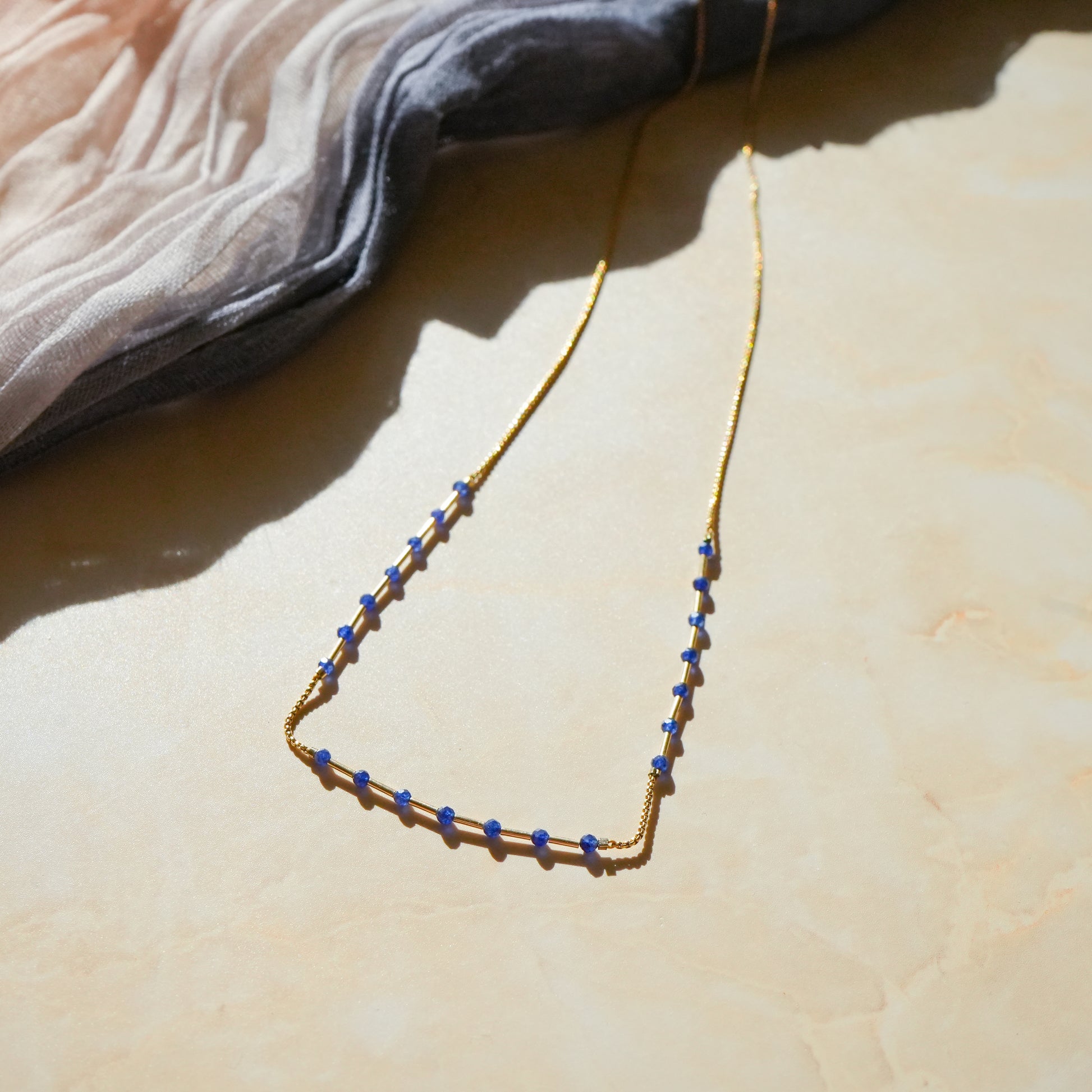 Embrace wisdom and enlightenment with lapis lazuli, a stone of intellect and understanding, elegantly displayed on a gold box chain with three sections of seven stones, symbolizing 777, a sacred number often associated with wisdom.